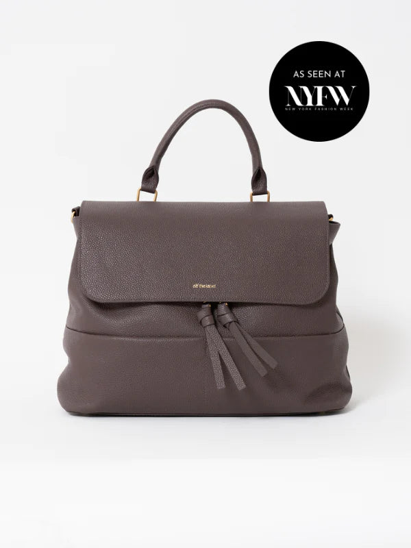 Additional Details: Custom laser cut leather knot tassels at closure and internal D-ring to attach accessories to.