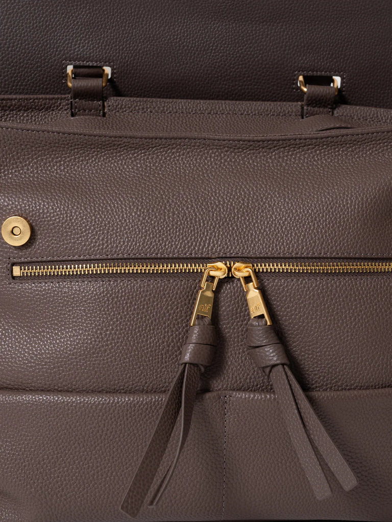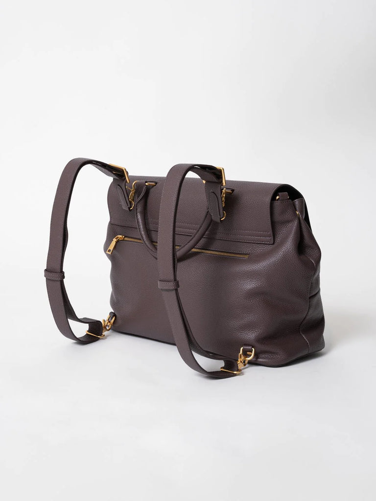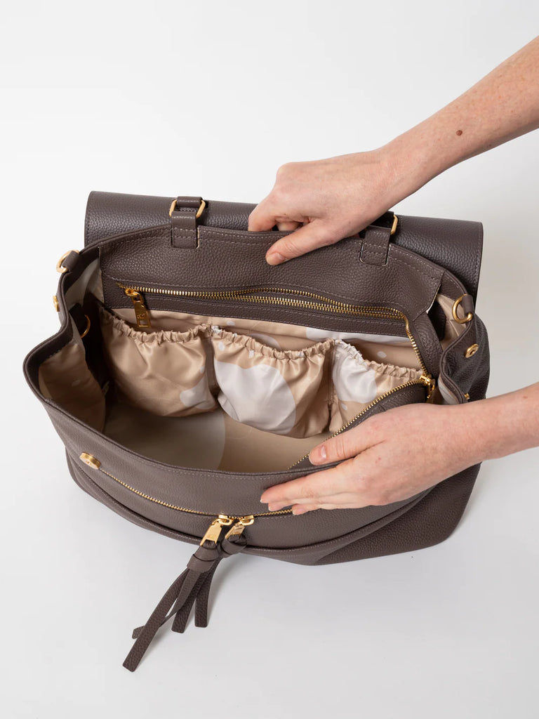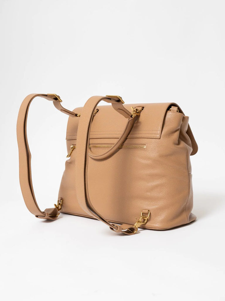A luxury baby bag, for parenthood in style. The Luxe Ari convertible backpack is crafted in high quality and full grain pebbled leather with bespoke brushed brass gold alloy hardware and a foil emboss logo. The leather outer features a top handle, two front pockets, a zipped back pocket and two adjustable back straps for ease of wear. The interior features seven internal compartments and wipeable custom lining.