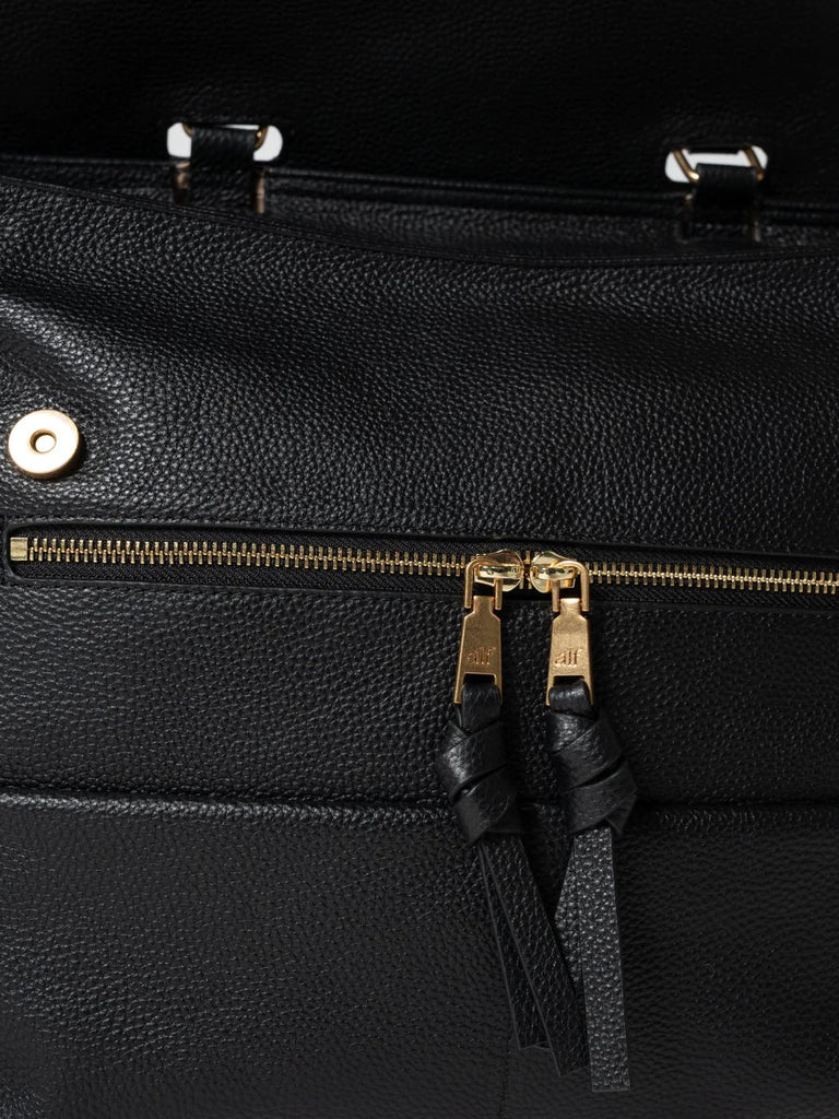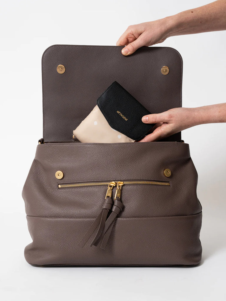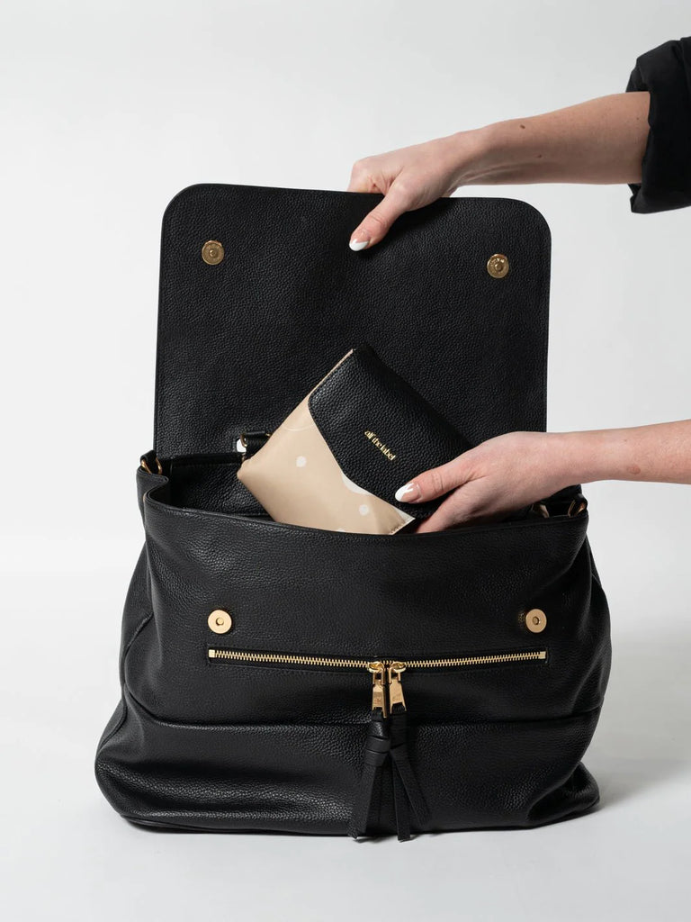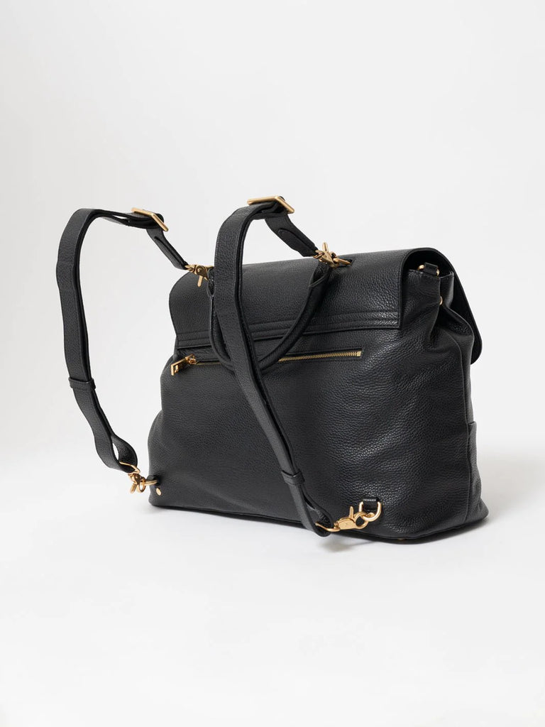 A luxury baby bag, for parenthood in style. The Luxe Ari convertible backpack is crafted in high quality and full grain pebbled leather with bespoke brushed brass gold alloy hardware and a foil emboss logo. The leather outer features a top handle, two front pockets, a zipped back pocket and two adjustable back straps for ease of wear. The interior features seven internal compartments and wipeable custom lining.