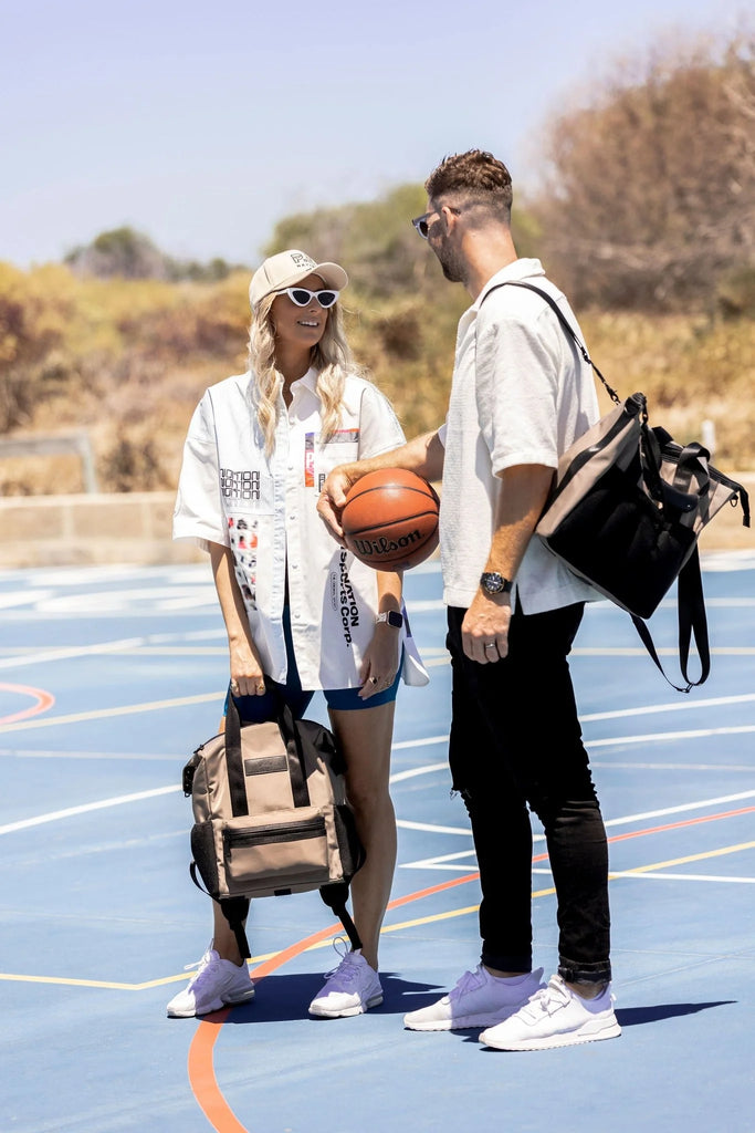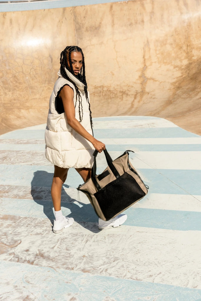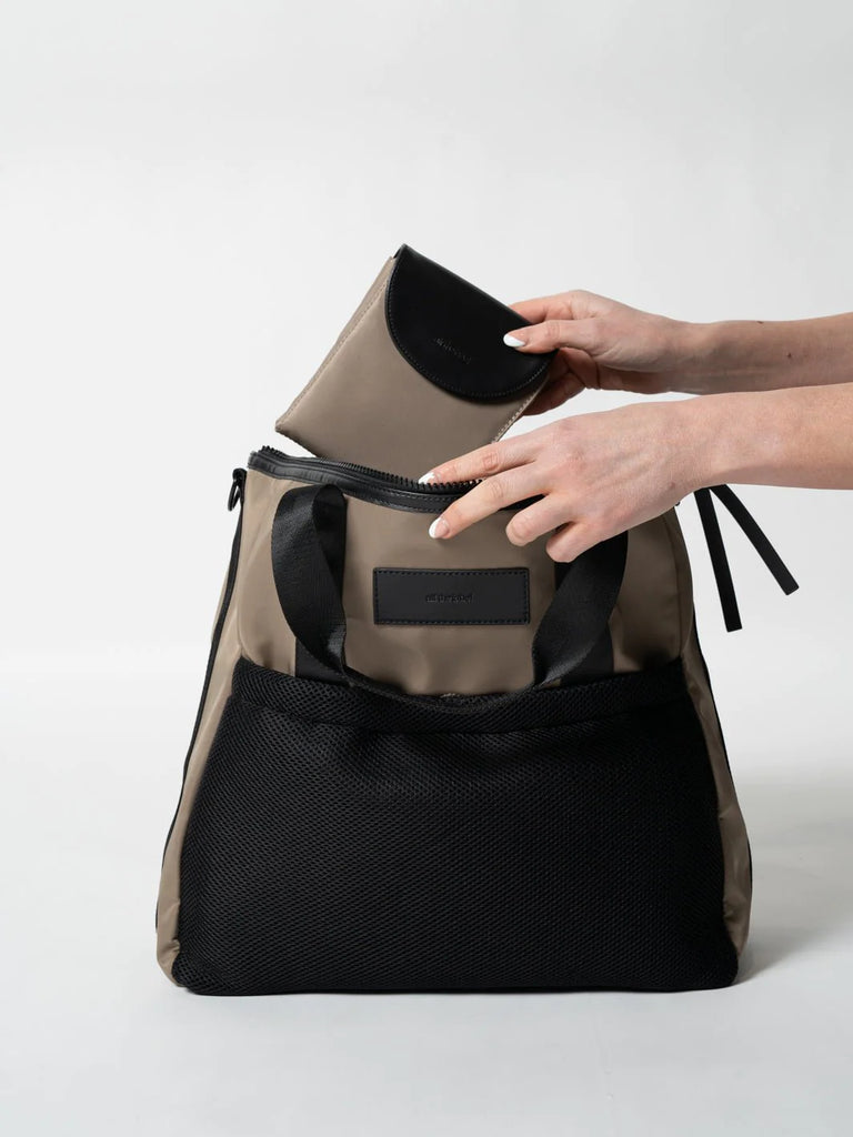 The perfect baby bag, tote-backpack for an active parent, which transforms to the ultimate gym or everyday tote once your little ones have grown. The Ted Tote from our Athletica range is designed with a focus on unisex wear and sustainability. Ted is crafted from eco-nylon and the highest quality vegan leather, features black alloy hardware and a statement knot tassel detail. This tote is equipped with two large external pockets, one with feature mesh and magnet closure and the other zip closure, and opens to seven internal pockets including a large slider pocket, five elasticised bottle pockets and a zip pocket to keep your valuables safe.