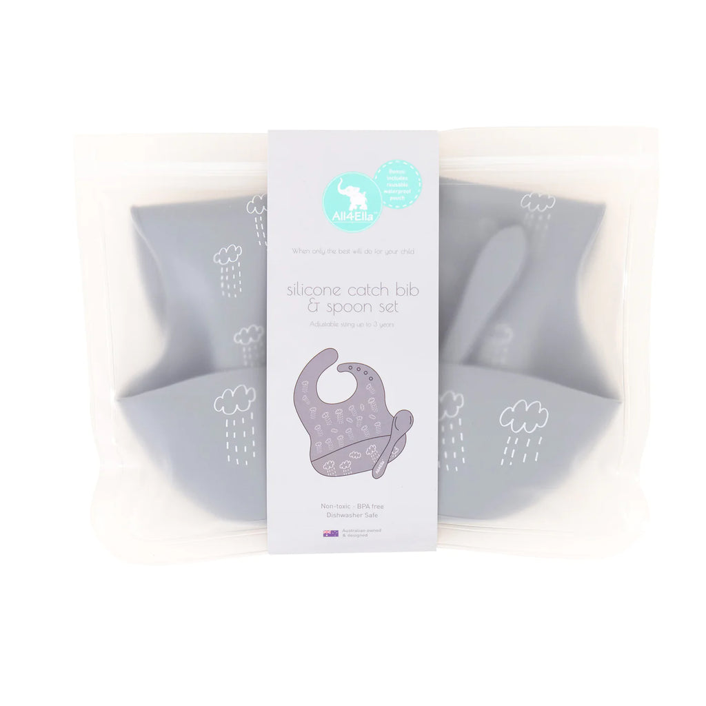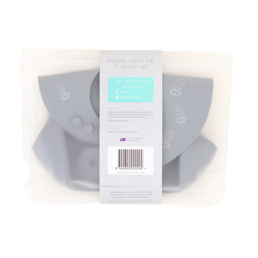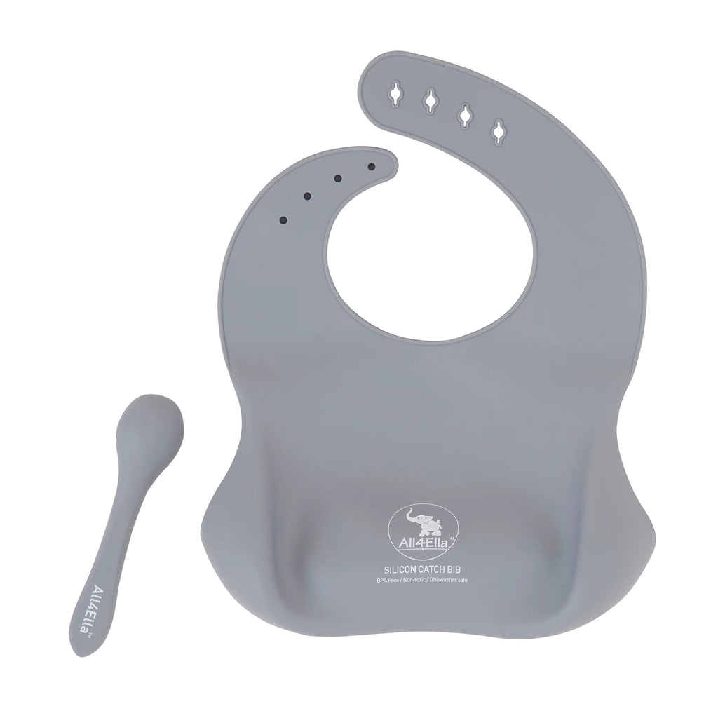 Made from soft, durable food-grade silicone our Grey silicone bib has a handy deep spill pocket to catch food and keep mealtimes mess free.
