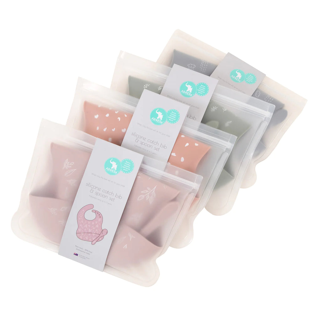 Our silicone bibs come with a matching soft silicone spoon perfect for little gums. Each set is packaged in a reusable pouch making it handy for when out and about.