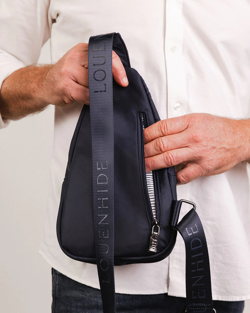 The Louenhide BoydNylon Sling Bag is an on-trend unisex sling bag designed with both style and functionality in mind. Organisation has never been easier with the three-section design, your valuables are within easy reach and secured safely with the stylish gunmetal zippers. Whether you're chasing an urban aesthetic or embodying an off-duty street style, this unisex nylon sling bag adapts to any casual outfit, enhancing your personal style while still offering ultimate practicality. The Boyd Navy features an adjustable sateen webbing guitar strap and a lightweight nylon material for ultimate comfort.
