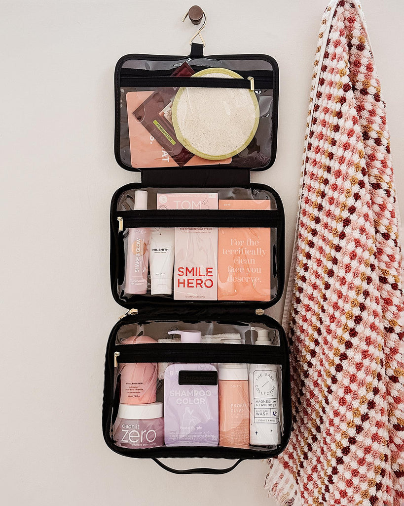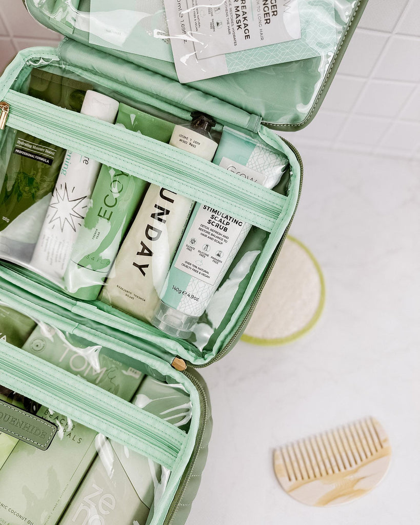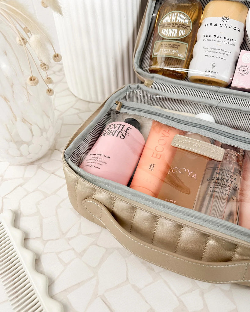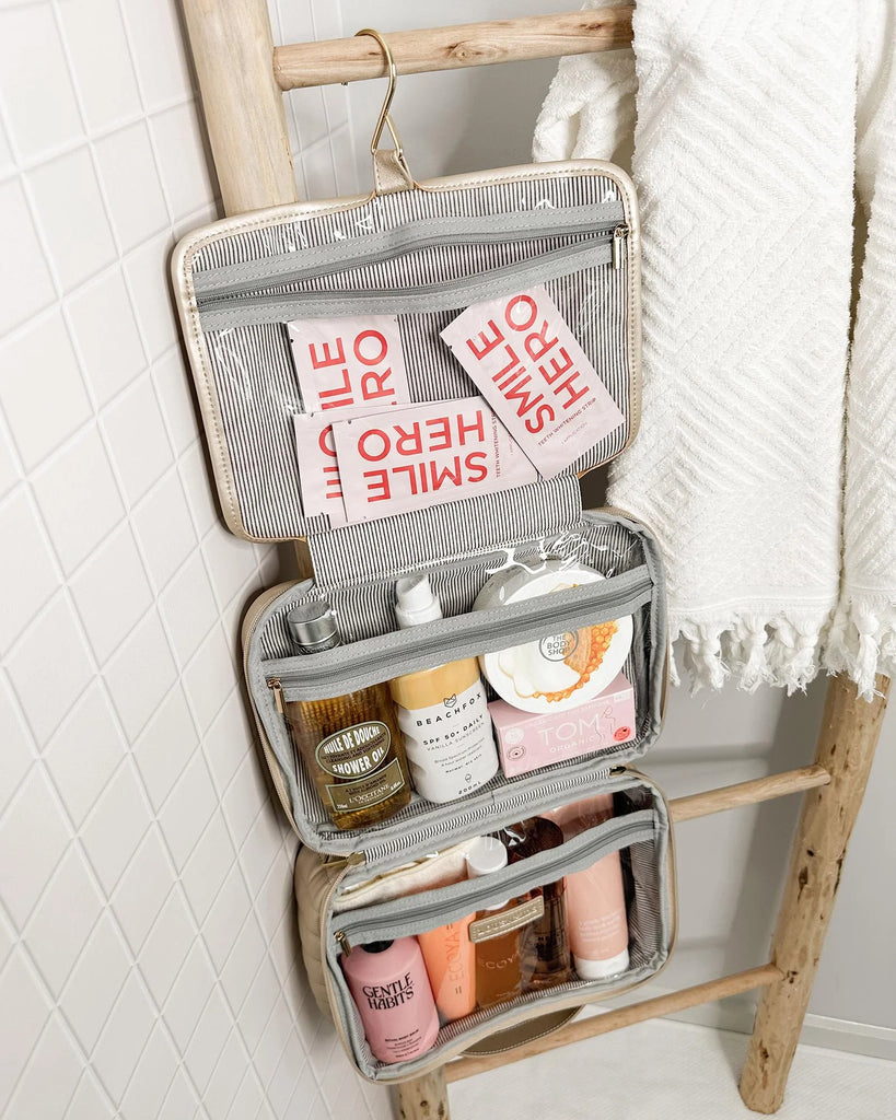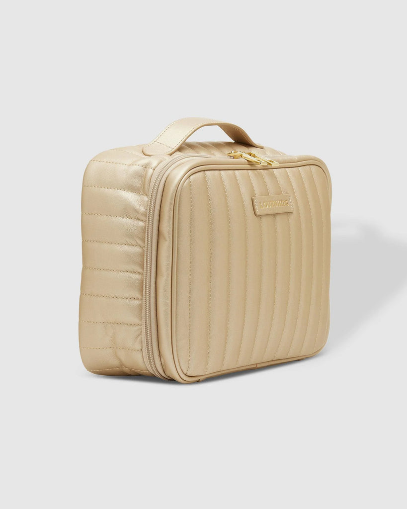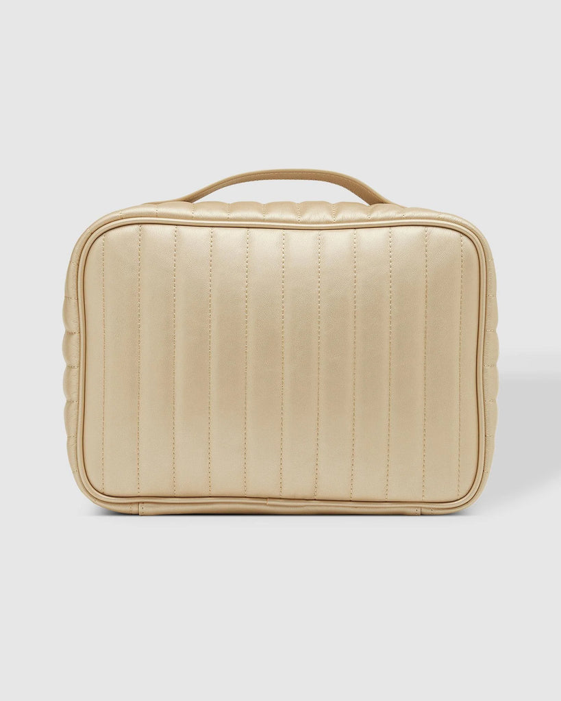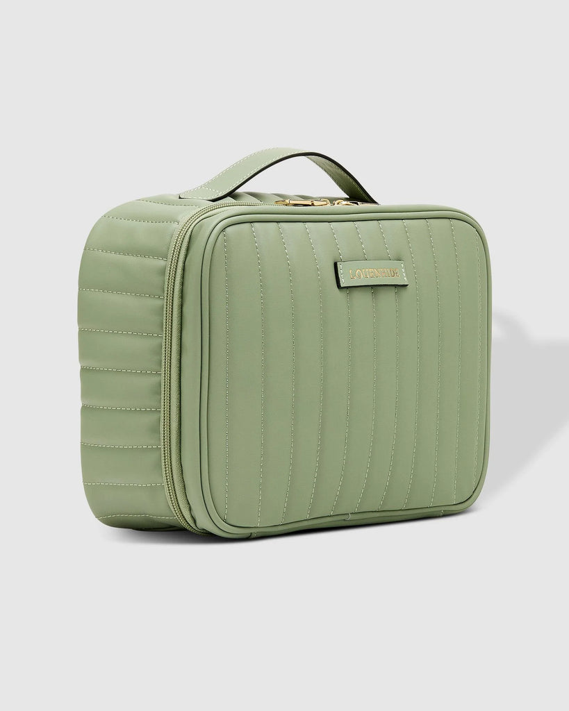 The Louenhide Maggie Cosmetic case is a beautiful quilted large makeup bag. Designed to be functional and spacious with three zipped compartments to store you makeup, skincare, and toiletries all in one. Comes with a hanging hook for easy access on the go! Take with you on weekend adventures or around the world!