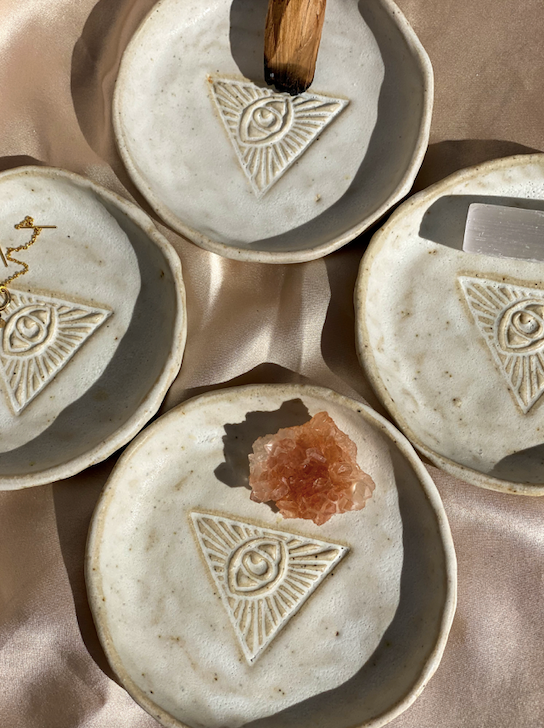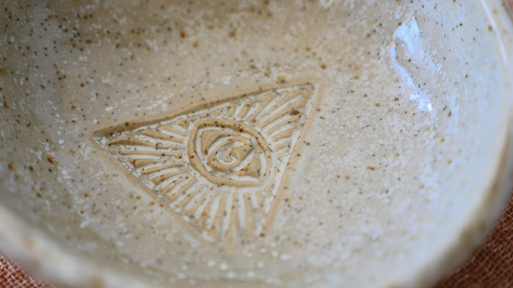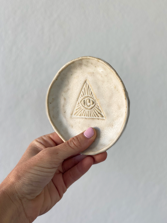 Unique and organic little dish with the Eye of Providence symbol. Beautiful crusty white glaze on speckled stoneware.
