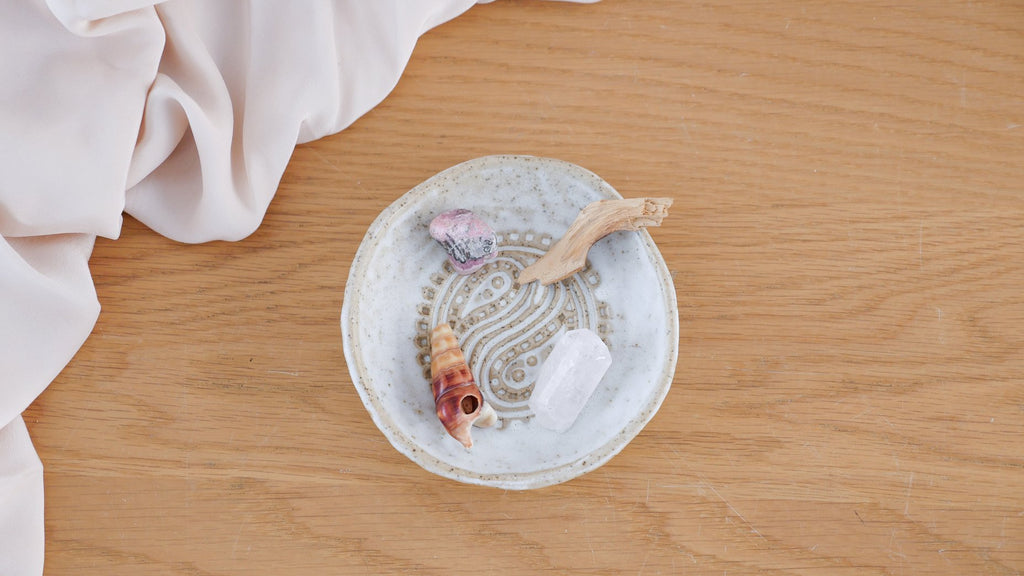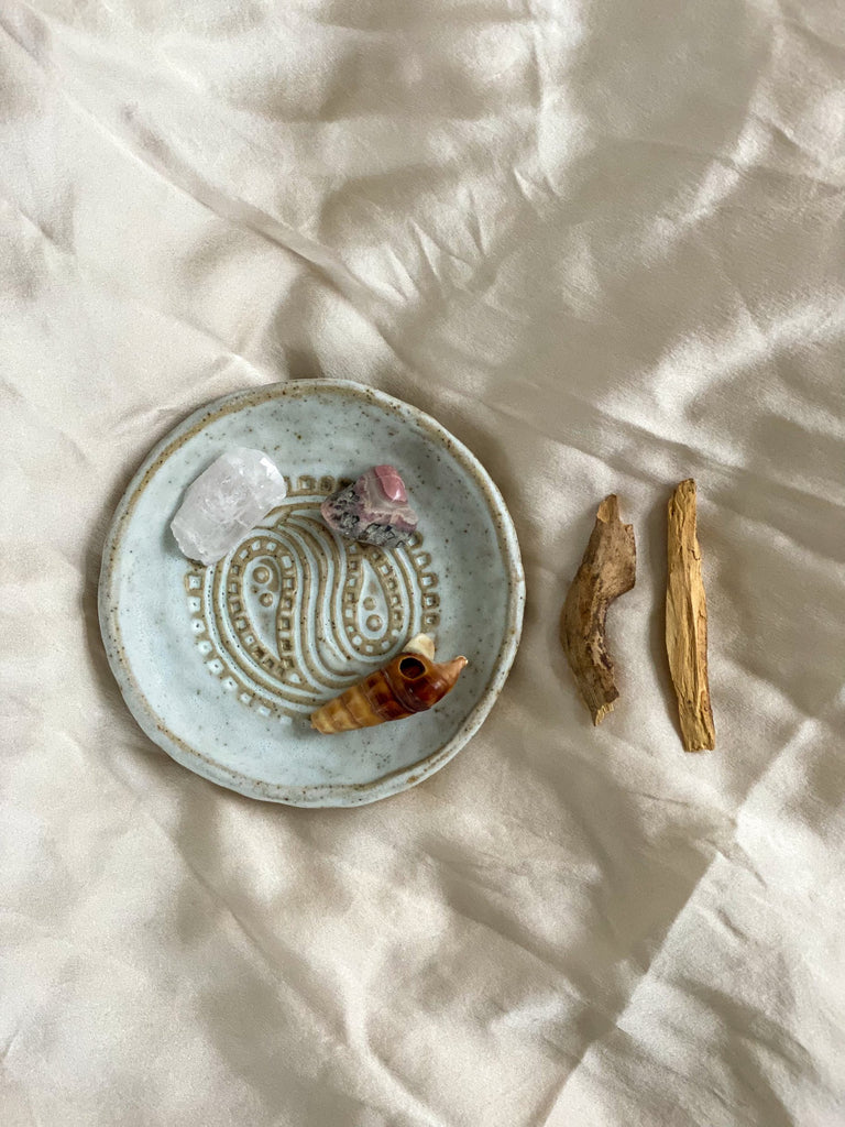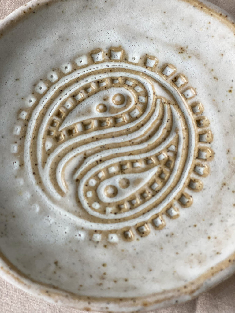 Unique and organic little dish with the Yin and Yang symbol. Beautiful crusty white glaze on speckled stoneware.
