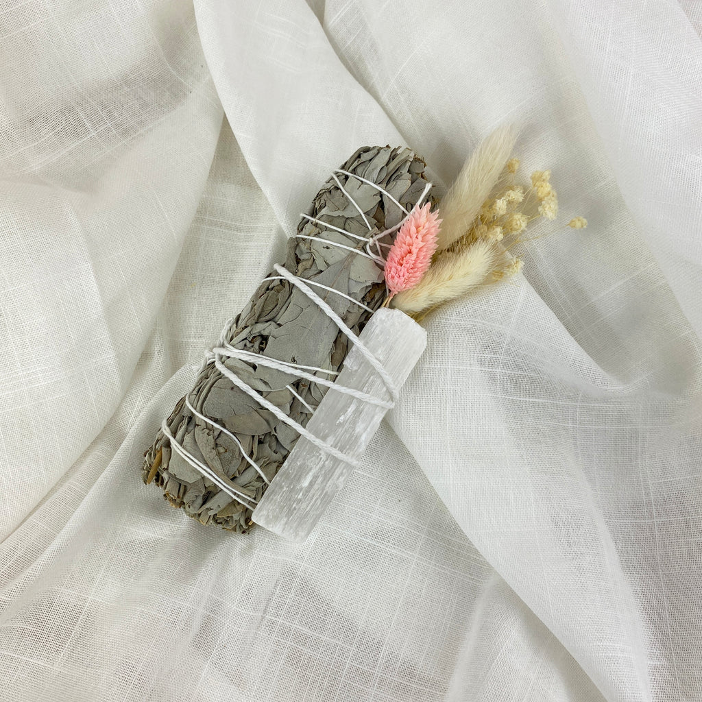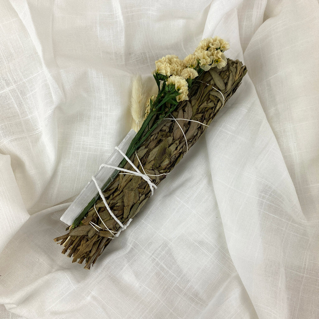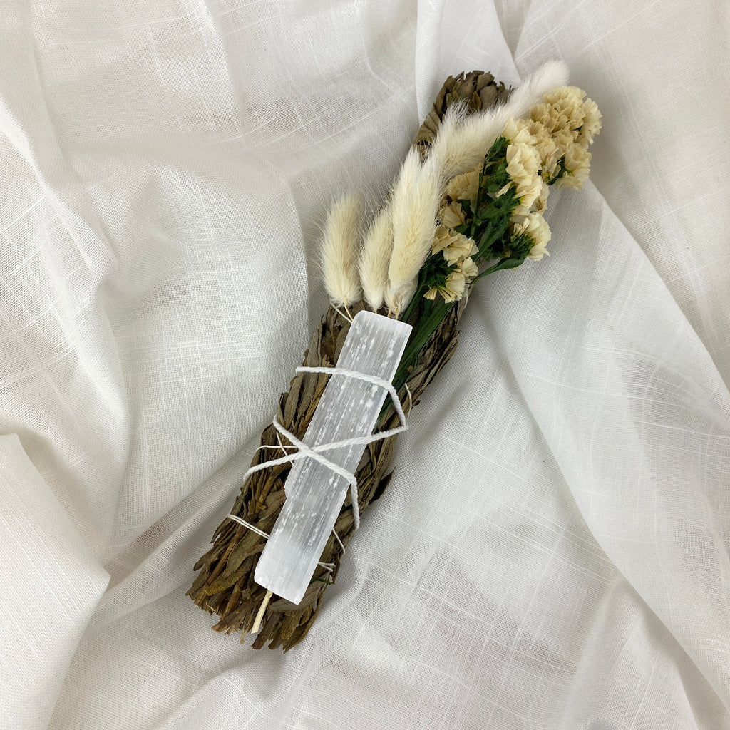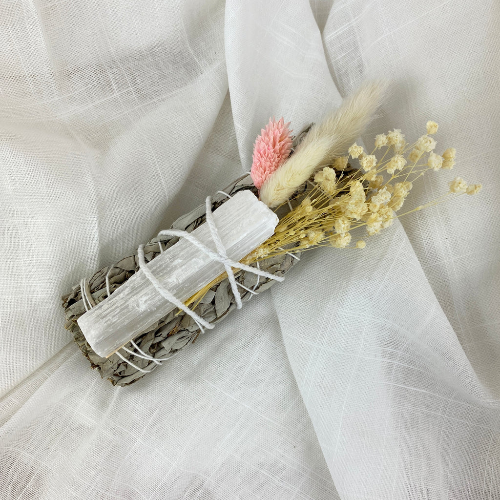 Both sizes include smudge stick + white selenite raw crystal, hand wrapped with a selection of beautiful dried flowers.