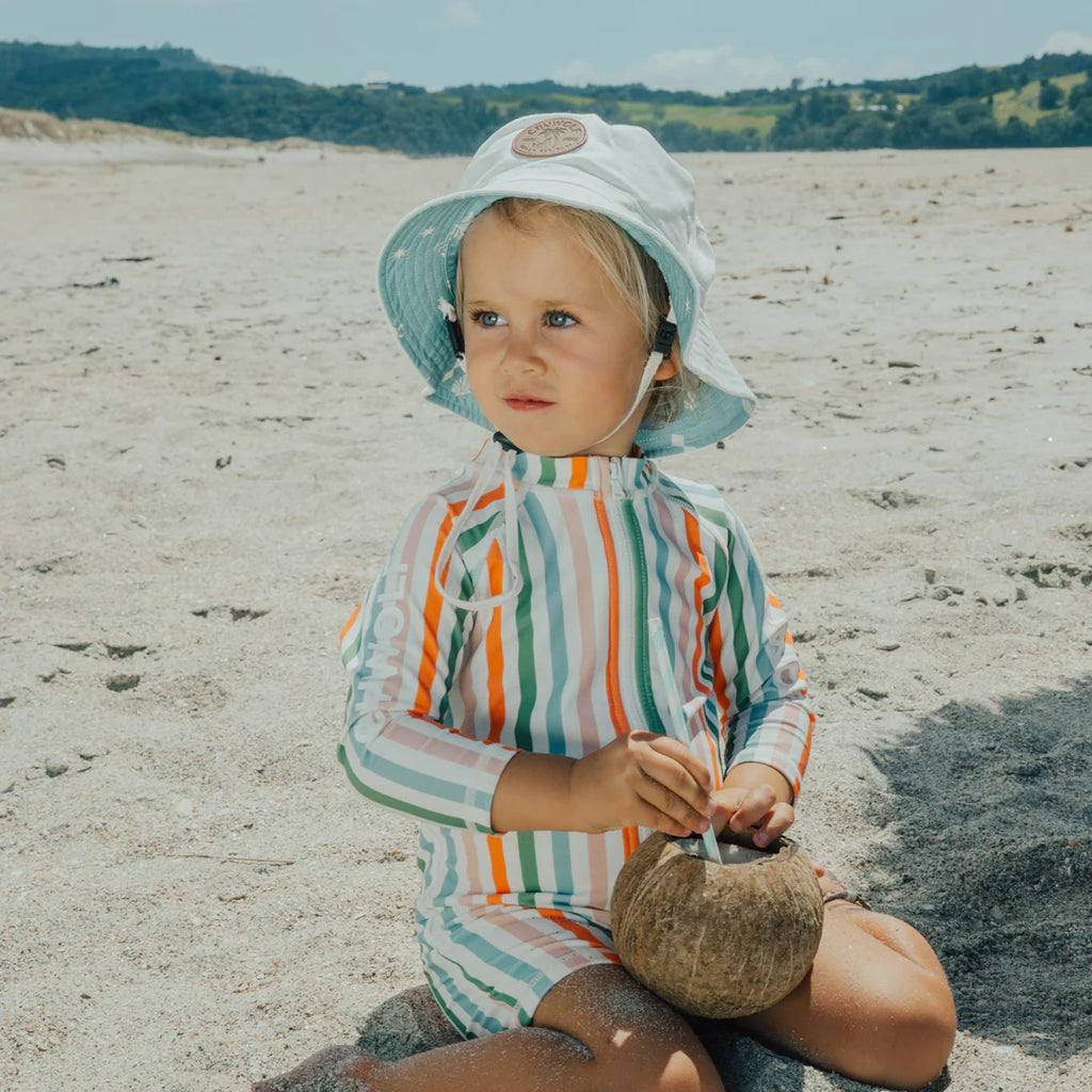 Crywolf UPF 50+ Rash Suits are designed to protect the littlest wolves at the beach and pool with an excellent sun protection rating and chlorine-resistant properties. The clever leg domes make nappy changing a breeze and the ample stretch and breathable fabric provide maximum comfort for all-day fun. Available in sizes 6-12 months – 3 years, in a range of fresh modern prints and colourways.