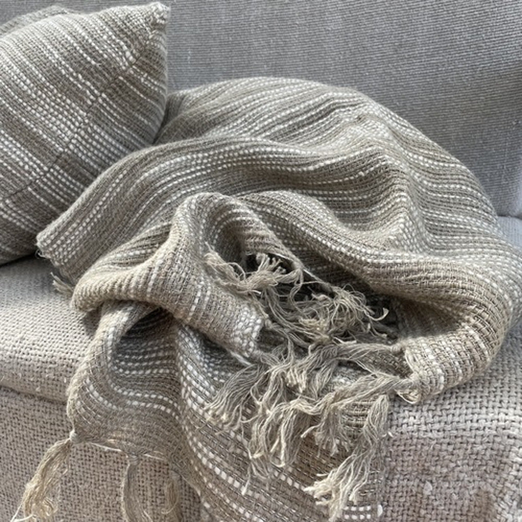 Rustic, richly textured linen cushion cover made from 100% pure linen in a thick weave. The color of this throw is natural linen woven with white linen.