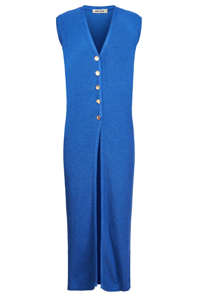 A soft waffle knit vest, made to layer. Features gold buttons at waist and open hem. Longer length for versatile styling. Crafted from 100% cotton.