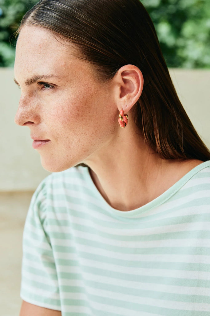 Twisted hoop earrings with bold enamel and gold-tone detailing. A subtle pop of colour.