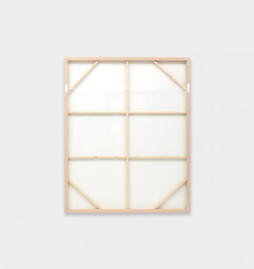 Stretched cotton blend canvas, timber veneer outer frame, pine stretcher backing frame.