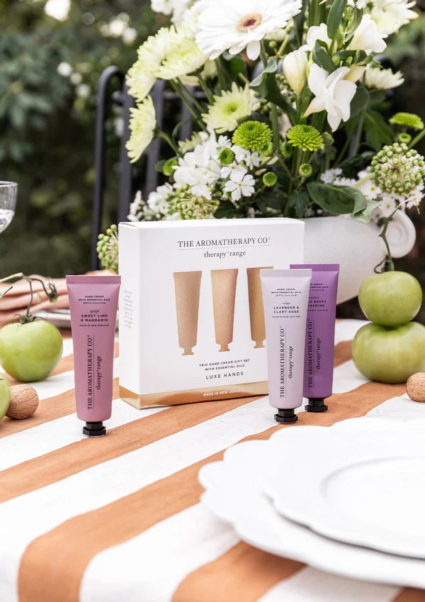 Lavished with Avocado, Kawakawa and Coconut oils to soothe and restore moisture, and SPF15 to help protect against sun damage. Made in New Zealand, this Limited Edition gift set contains three mini 30ml Therapy hand creams in our three most loved aromas. relax - Lavender & Clary Sage Unwind, slow down & escape with this sweet, serene fragrant blend. restore - Wild Berry & Jasmine Take a breath and revive your senses with this restorative aroma. uplift - Sweet Lime & Mandarin Illuminate your inner energy with this fresh, aromatic pick me up.