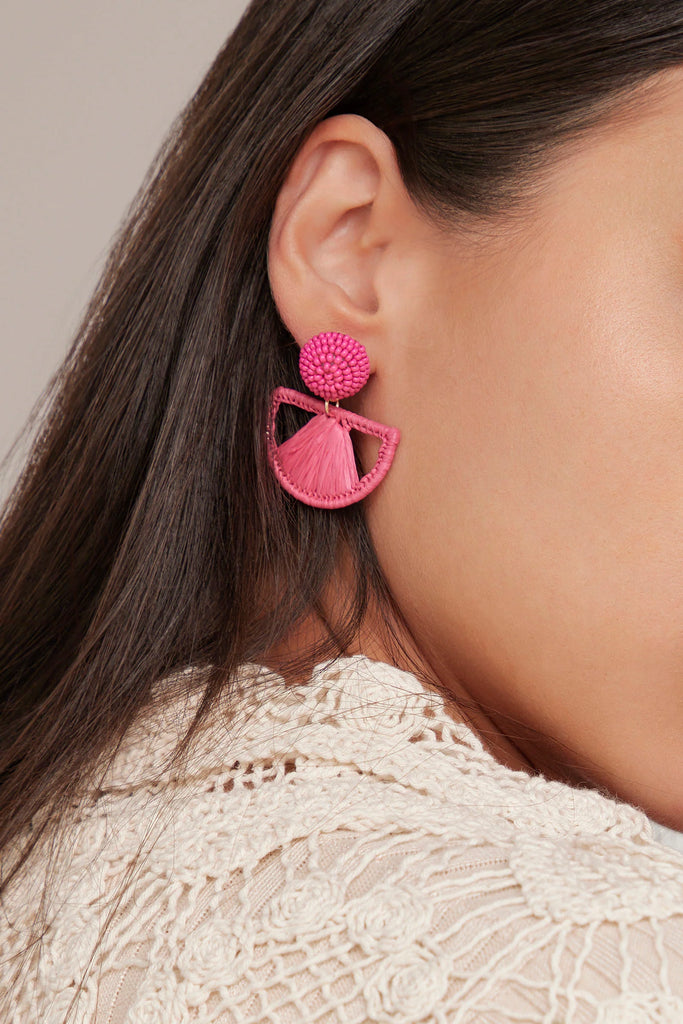 Perfect for festive gatherings, the Giselle Earring shines in any celebration. This gorgeous earring features a beaded stud closure and a woven semi-circle drop. Available in vibrant summer shades, it will add a cheerful contrast and splash of colour to your party ensemble.