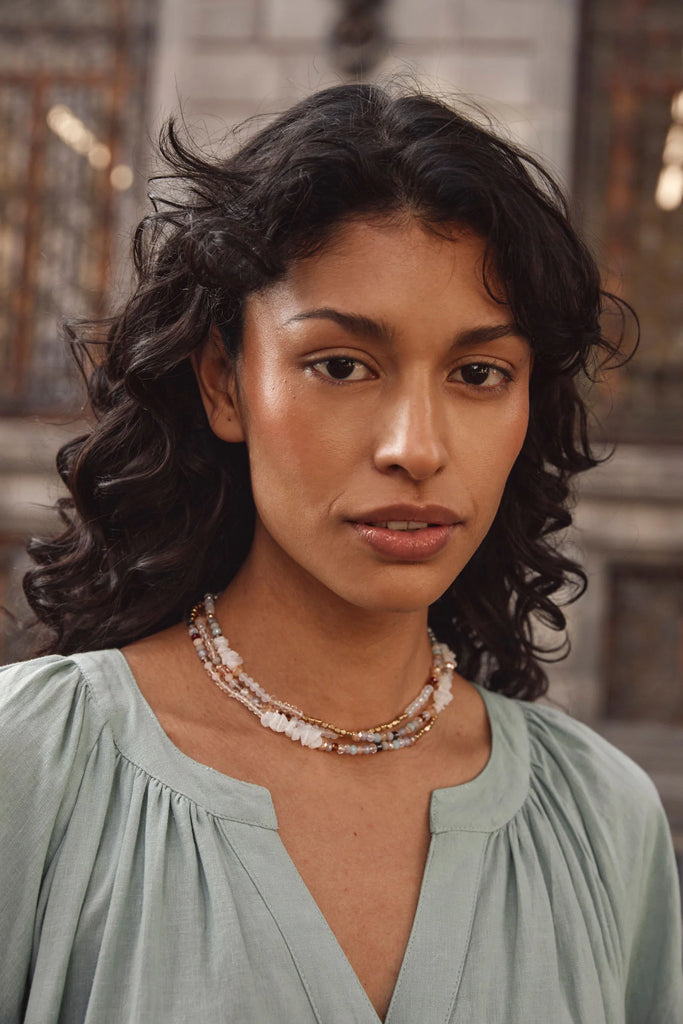 For a touch of effortless style this summer, look no further than the Nouveau Necklace. Crafted with a blend of cotton, iron, and stunning glass beads, it offers three unique designs that ensure you stand out. This necklace brings a timeless elegance to any ensemble, making it your new go-to accessory for every occasion.