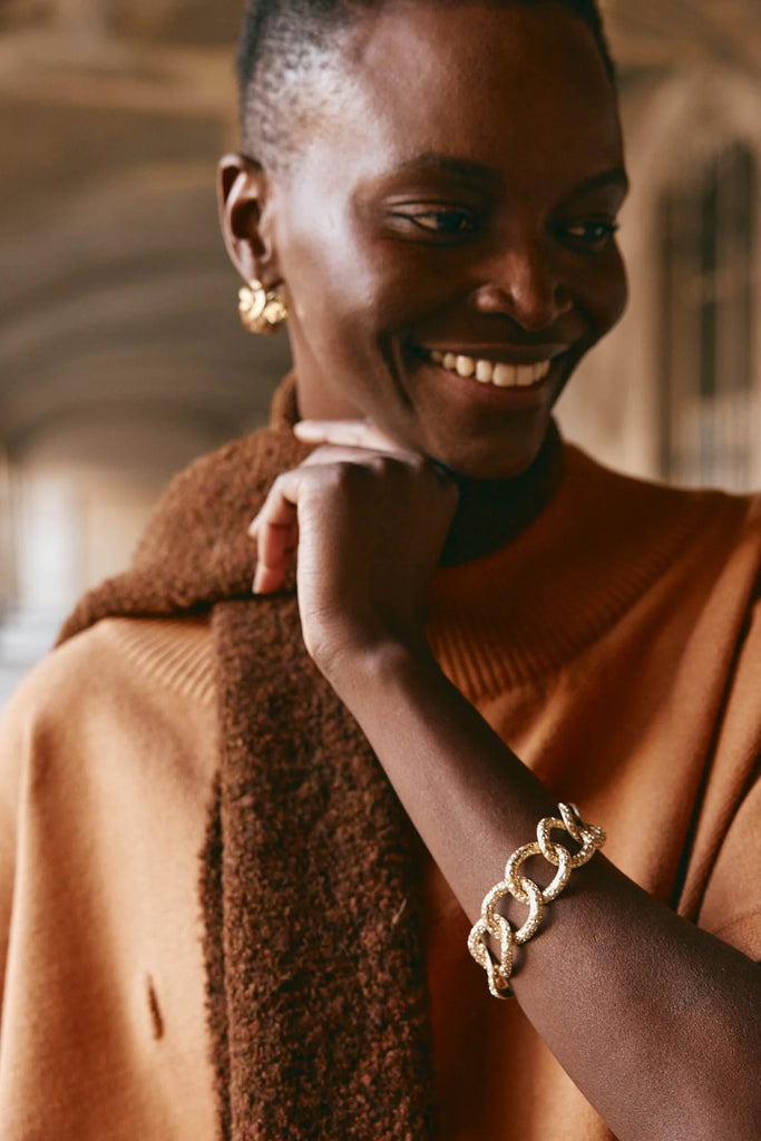 The Estel Bracelet is a timeless addition to your collection—a textured link bracelet that complements any outfit with ease. With an adjustable chain for a personalised fit, it's perfect for layering with matching pieces to achieve a chic, coordinated look.