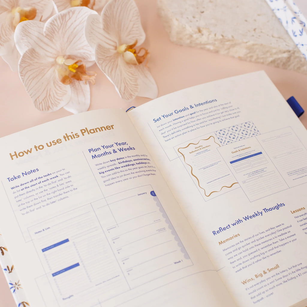 This planner is designed to simplify and enrich your life with so many handy tools and little details, from notes and lists, a space for thoughts, memories, wins and gratitude as well as space for goals and intentions.