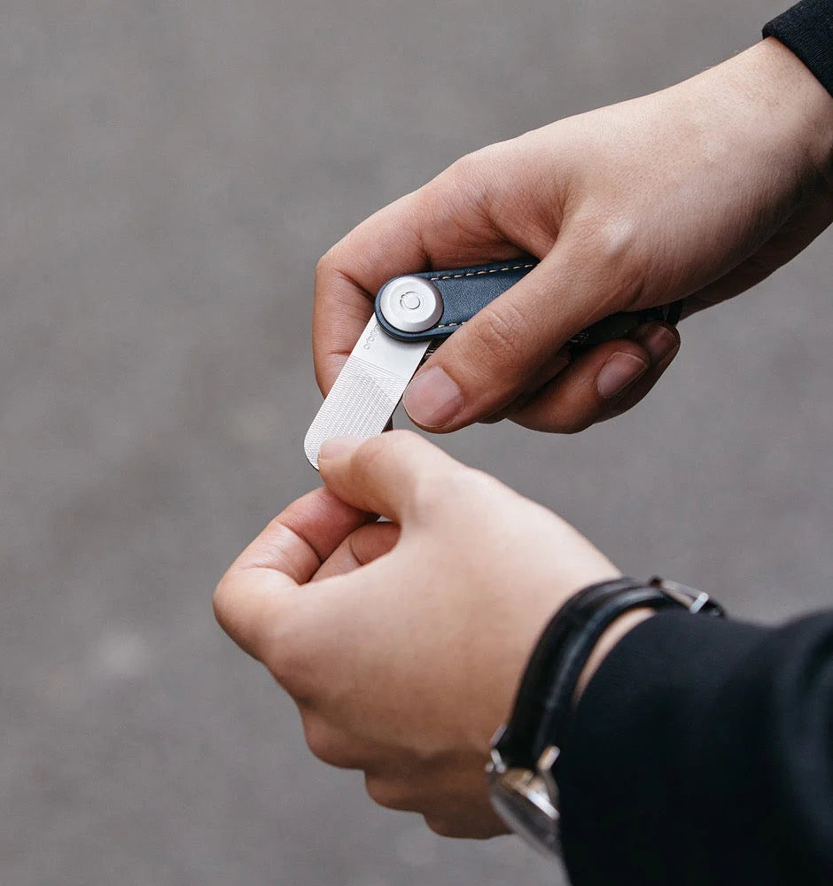 Orbitkey is continuing in its pursuit of conveniently providing the essentials of everyday living in the palm of your hands. The Orbitkey Nail File and Mirror fits seamlessly and easily inside your Orbitkey. It's guaranteed to fit neatly onto an Orbitkey Key Organiser along with seven keys. Made from stainless steel for maximum durability.