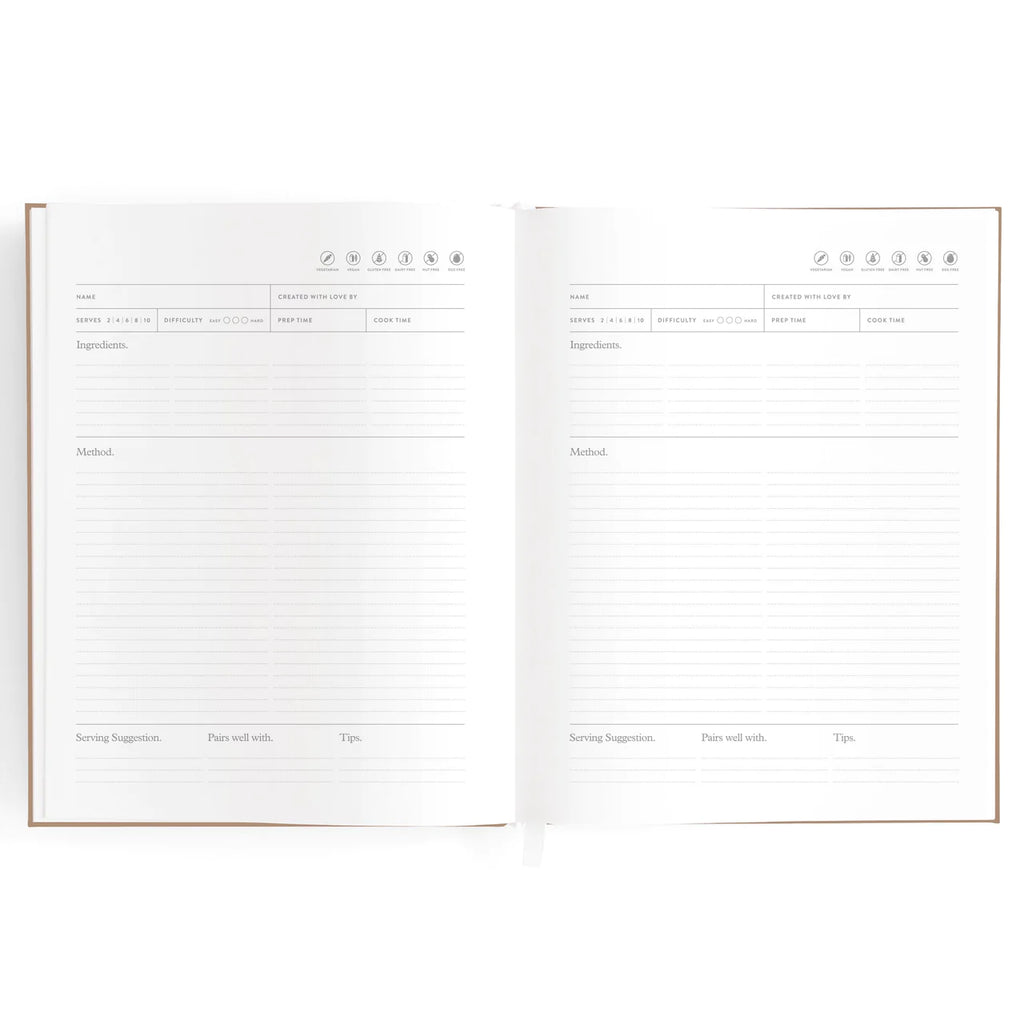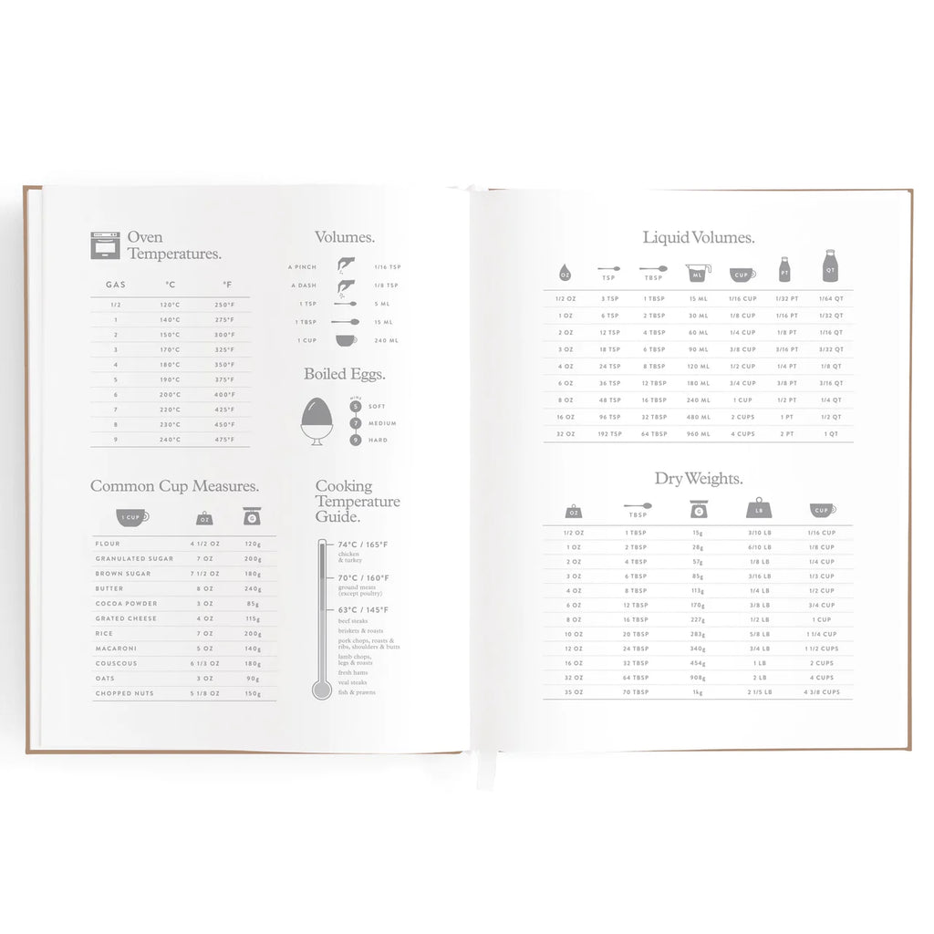 Includes handy cooking guide charts for temperatures, volumes, weights and cup measures. Space for dietary requirements, serving size, difficulty as well as serving and pairing suggestions. 174 blank recipe pages.