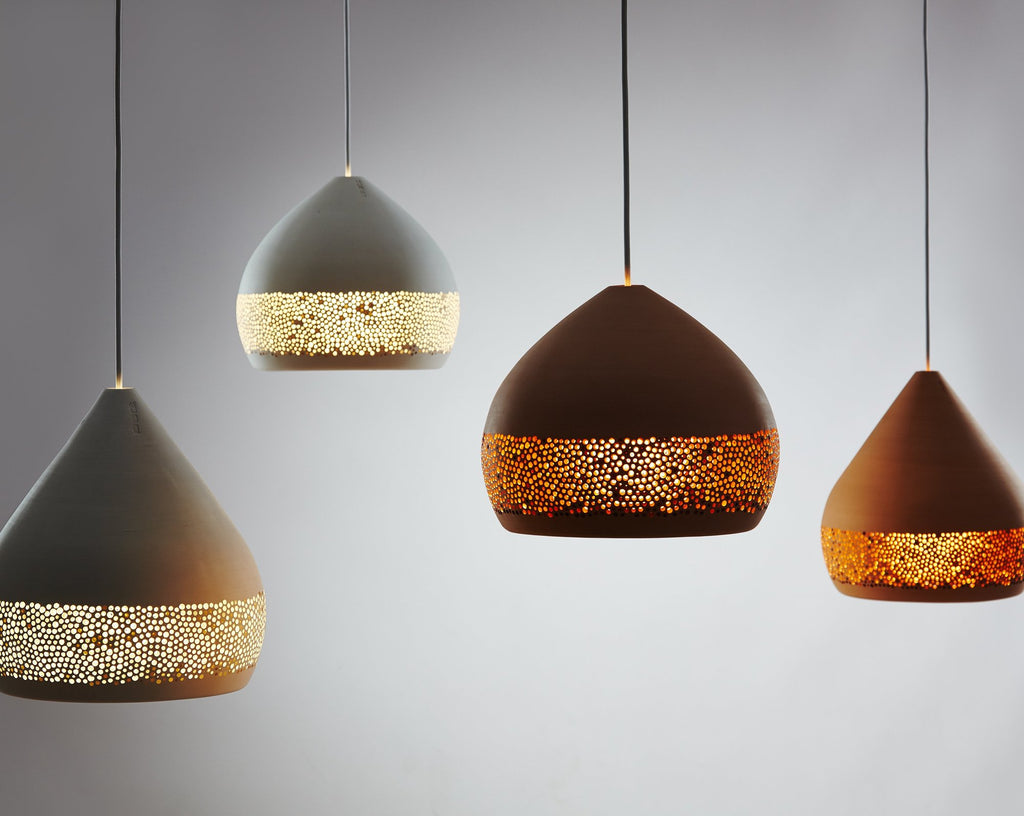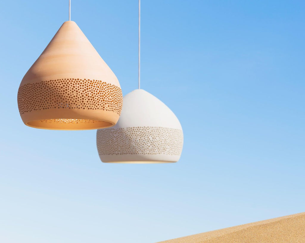 Handmade in Southern Spain, the SpongeOh pendant lights are a balanced juxtaposition of a smooth clay surface, typical of traditional pottery, and a distinctive porous strip, which allows light to flow into the room, creating a special textured atmosphere.
