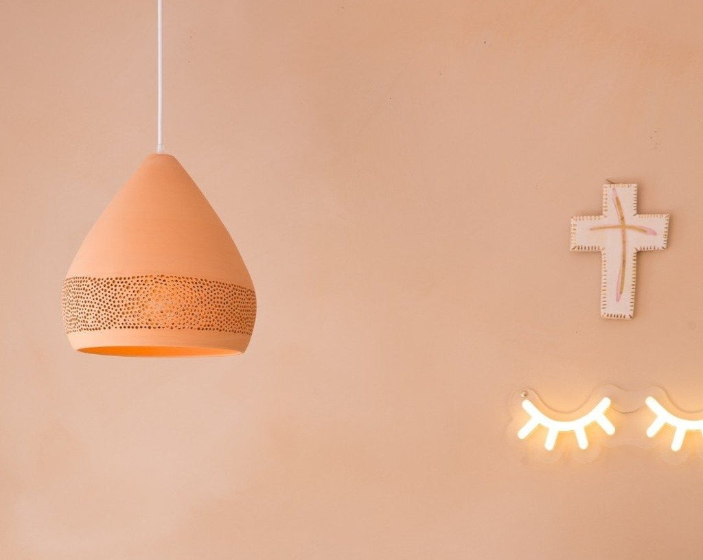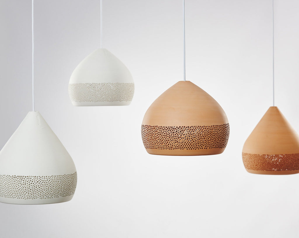 Made in Southern Spain, the SpongeOh pendant lights are a balanced juxtaposition of a smooth clay surface, typical of traditional pottery, and a distinctive porous strip, which allows light to flow into the room, creating a special textured atmosphere.