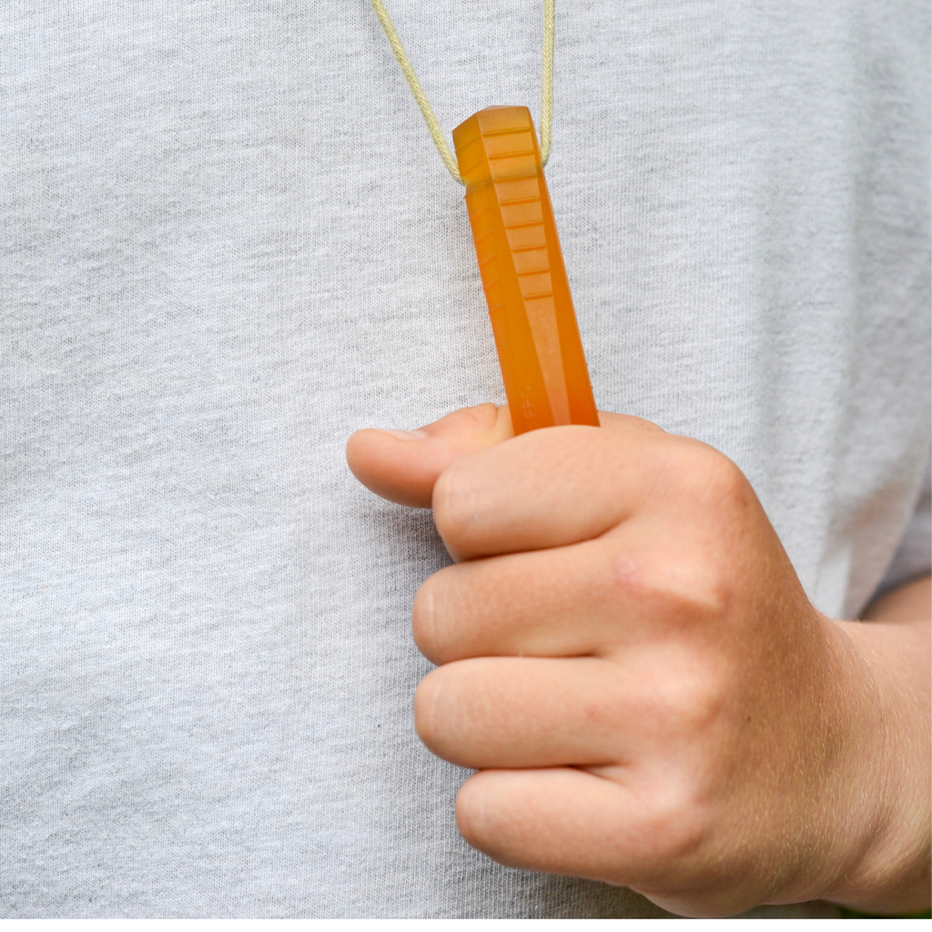 Each two-pack order contains: 100% Natural Rubber biodegradable pendant -Cotton woven cord with breakaway safety clasp for added safety -Ultra-chewy with added texture to provide satisfying oral-sensory input -Non-toxic, free from BPA, Phthalate, PVC and Nitrosamine -Gender neutral design -Complies with AU, CA, EU and US toy safety standards