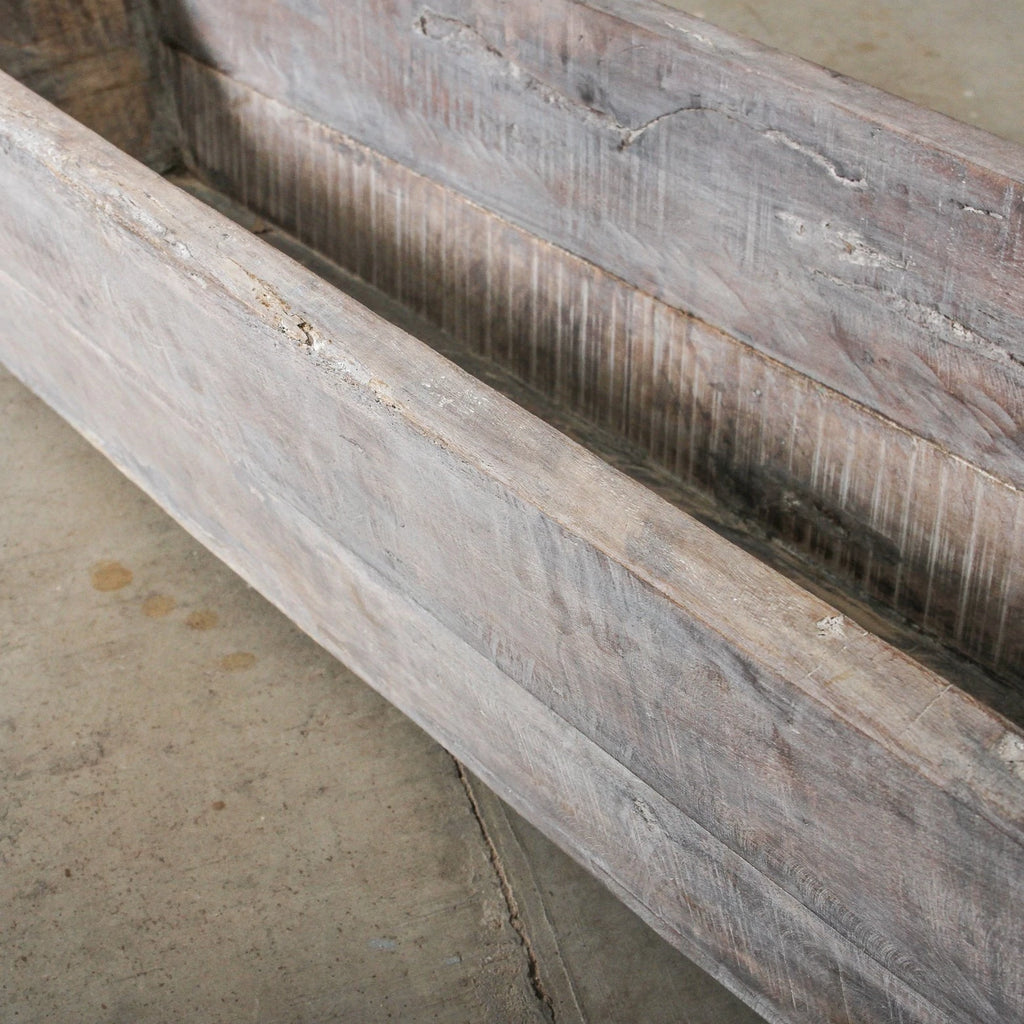 This beautiful piece was found in the heart of Rajasthan and chosen it for its organic textures and exquisite craftsmanship. In your home, it could be used as a planter box for small pots of herbs, or would make a beautiful, large tray on your kitchen bench. It would look great sitting atop a console table with a vignette of draped clay beads and brass trinkets, or even as part of a retail display. This piece was crafted from solid, whitewashed teak and has its original iron strapwork intact.