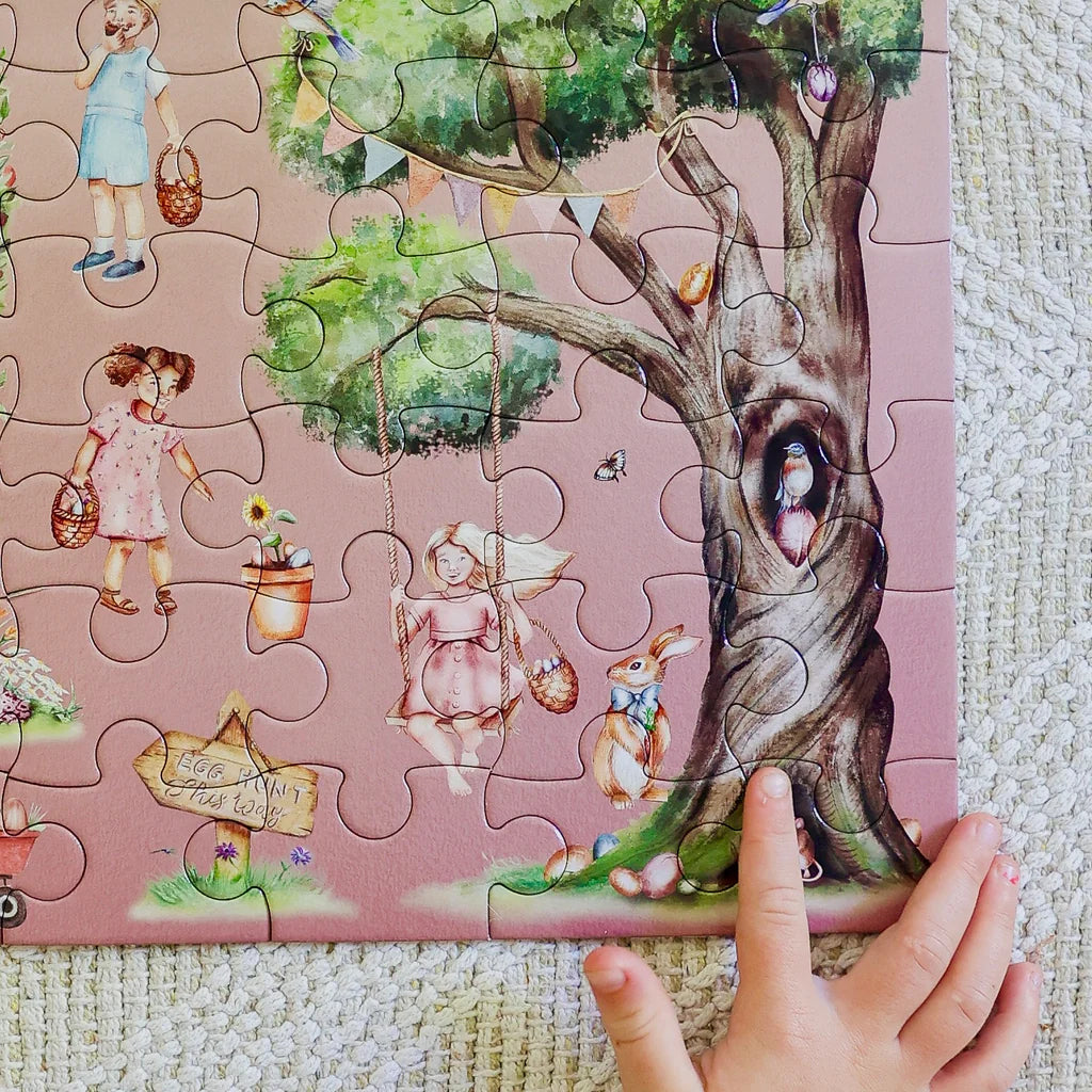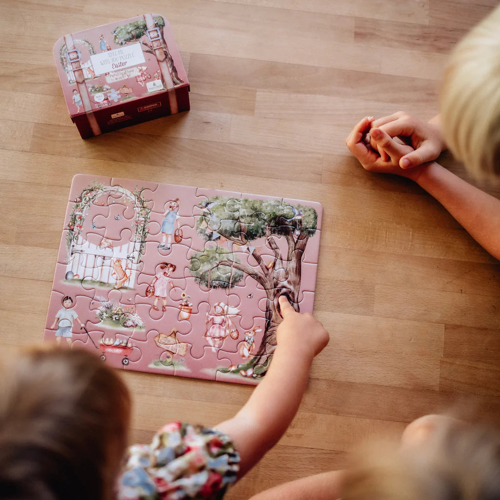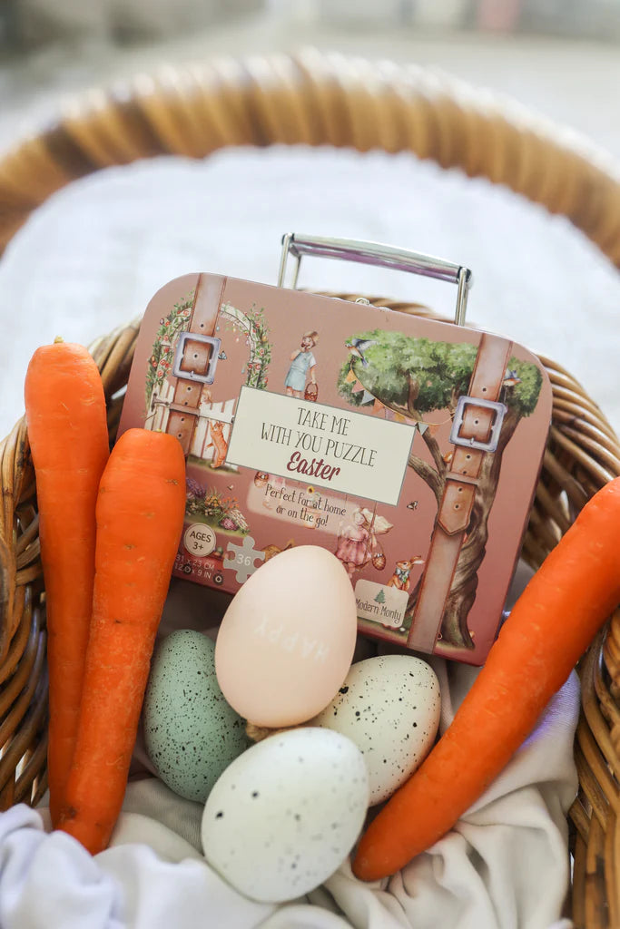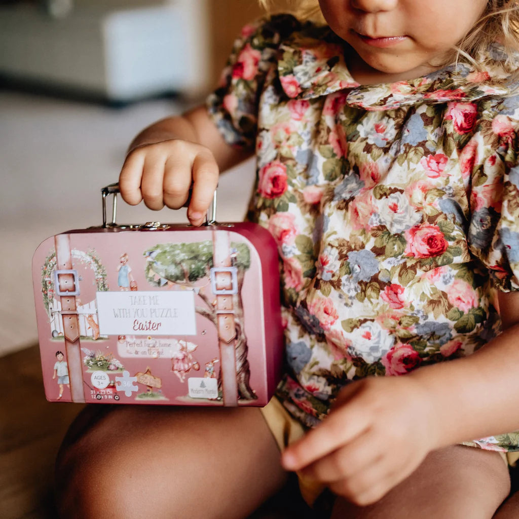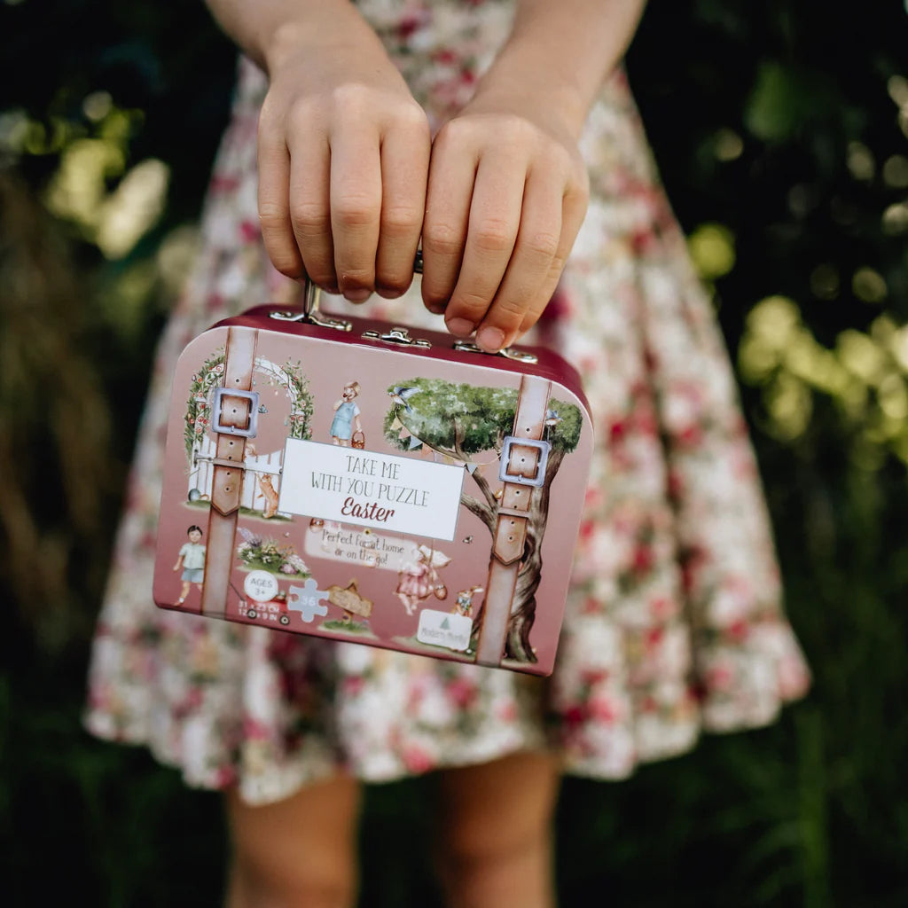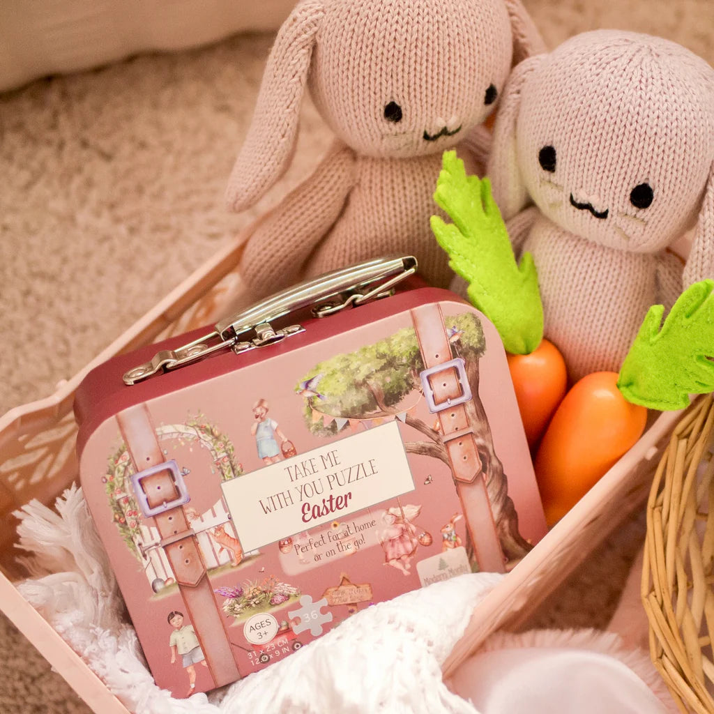 Our Easter "Take Me With You" Puzzle is a stunning 36 piece jigsaw puzzle, packaged in the sweetest mini suitcase with a durable metal handle and latch. The puzzle pieces themselves are made of recycled materials and will be found inside a luxe paper bag to ensure this is another earth-friendly, ZERO single-use plastic product.
