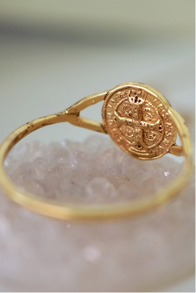 A delicate opal set on a vintage medal, with a cross detail inside the ring