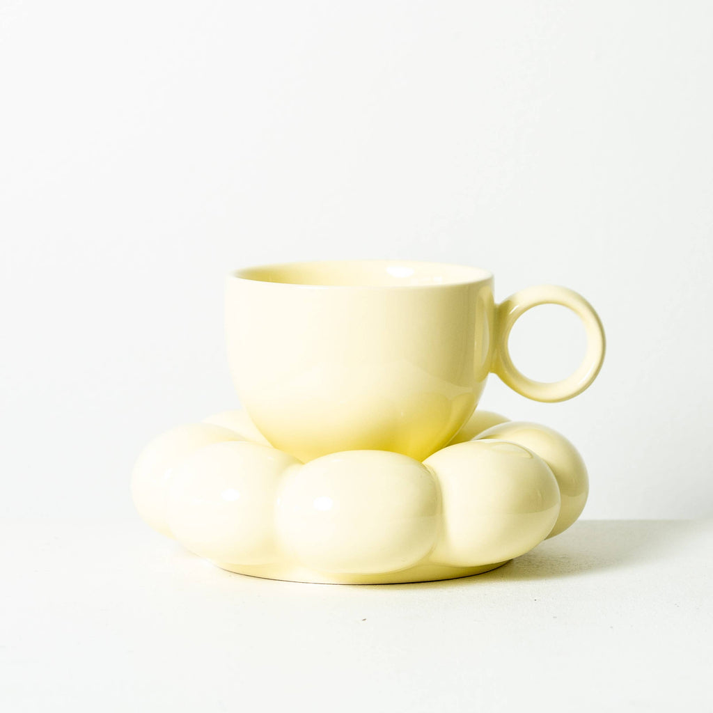 Elevate your morning ritual with the Lottie Mug and Saucer Set, available in the ethereal tones of white, pink, yellow and blue.