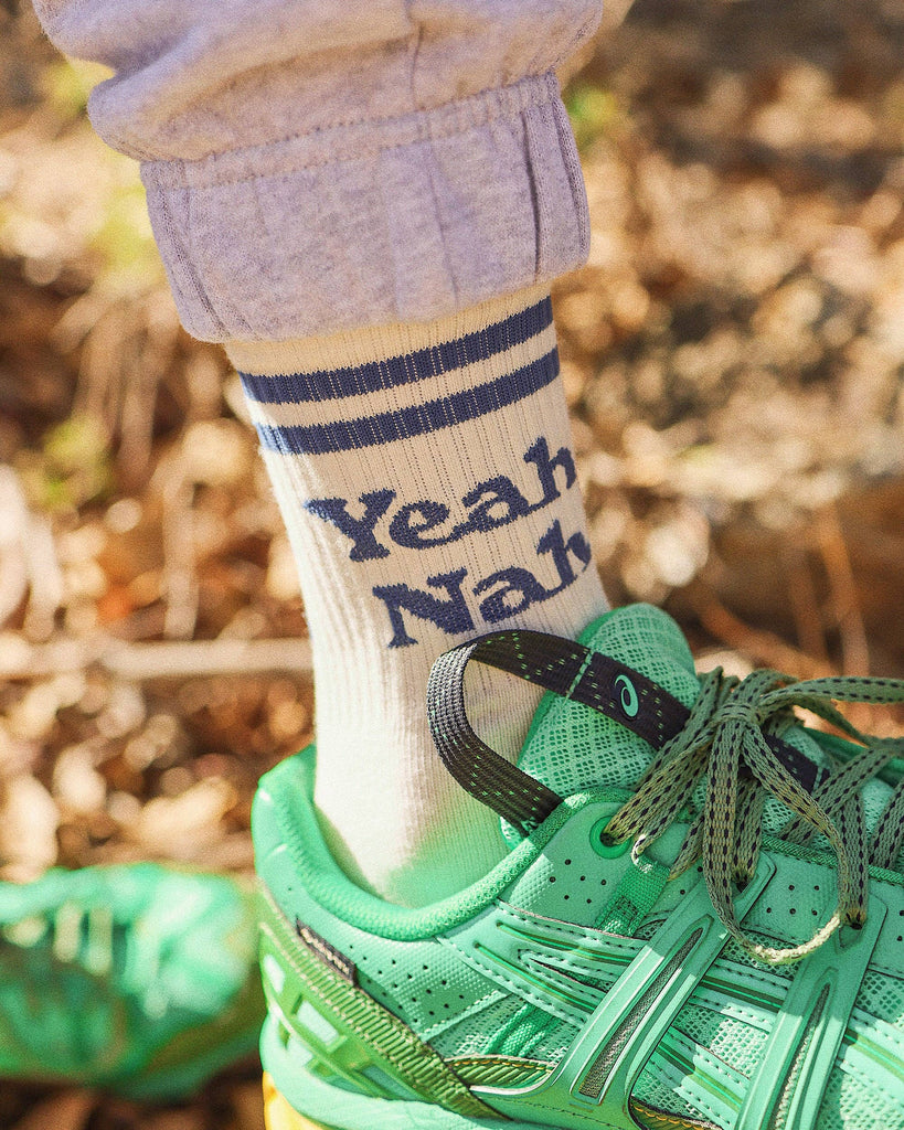 For kids who’ve already mastered the art of the cheeky comeback – the Kids Yeah Nah Socks in White are a fun nod to Aussie slang with a bold knitted Aussie slang logo and sporty double stripe. Comfy, breathable, and made to go the distance from playtime to park hangs.