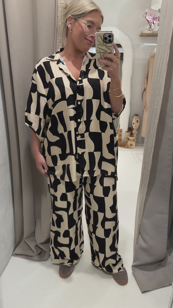 Effortless and eye-catching, the Alba Shirt blends relaxed comfort with statement style. Featuring a bold abstract print, this button-through design has a breezy oversized fit, curved hemline, and ¾ sleeves with subtle gather detail. Perfect for pairing with the matching Isla Pants for a coordinated look, or styled with denim for everyday wear.