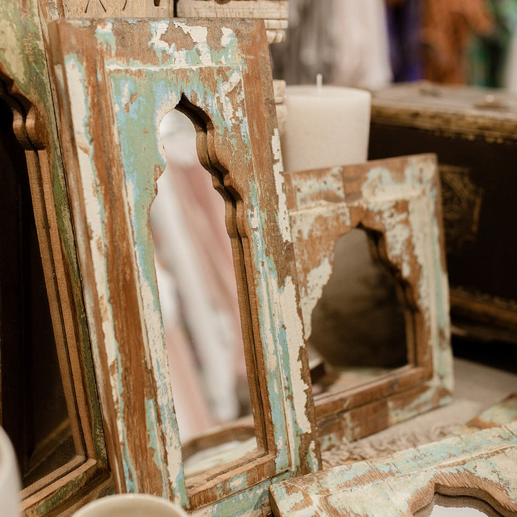 These one of a kind beautiful mirrors are from temples throughout India. These mirrors will be a special addition to any space, grouped together hung on a wall, or simply sitting on a console table as a decor piece.
