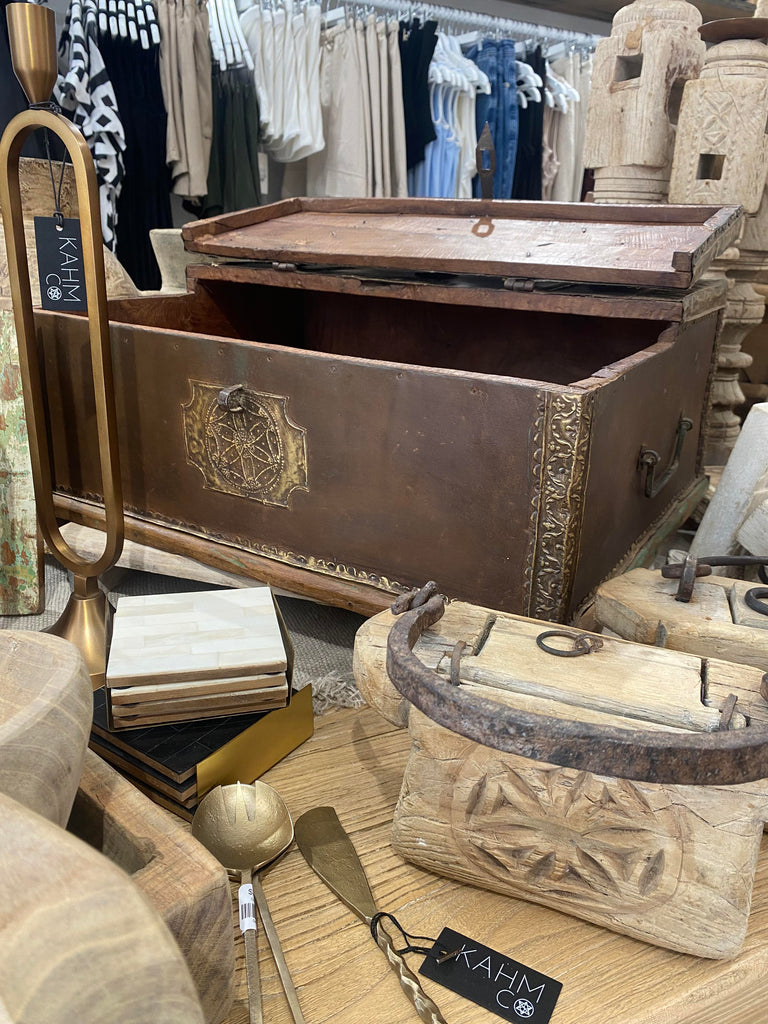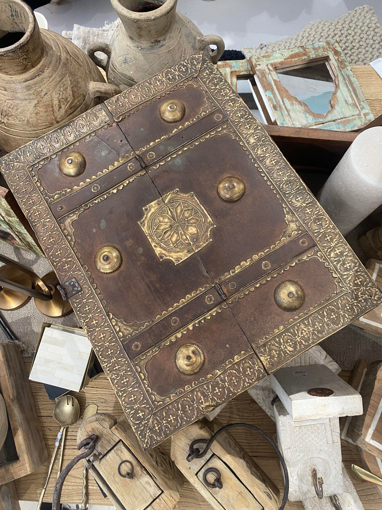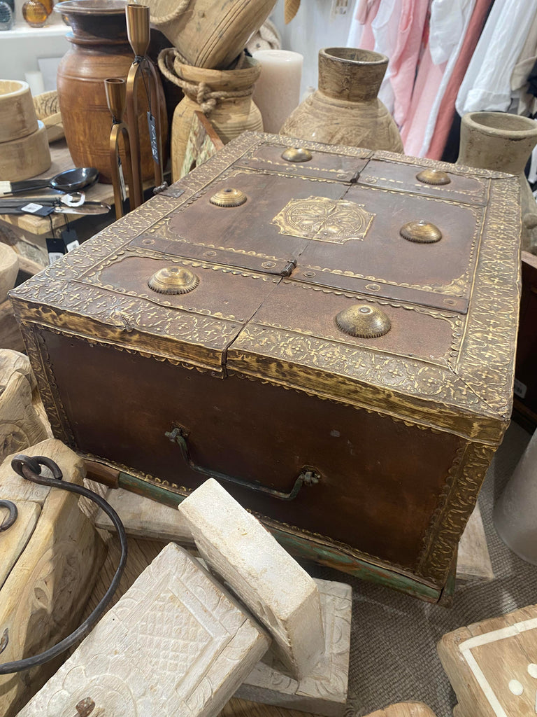 Handmade by craftsman in India, this antique storage box is complete with intricate design and brass fittings.
