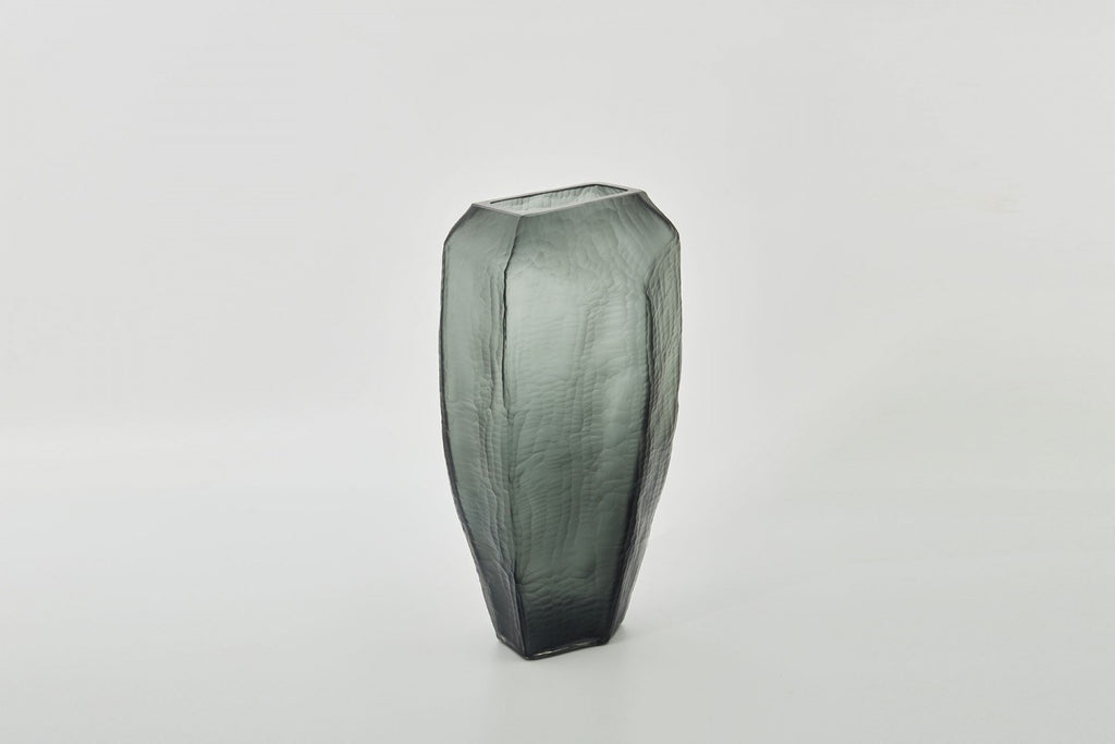 A dramatic statement is made with these oversized sculptural, handmade and hand etched glass vases.