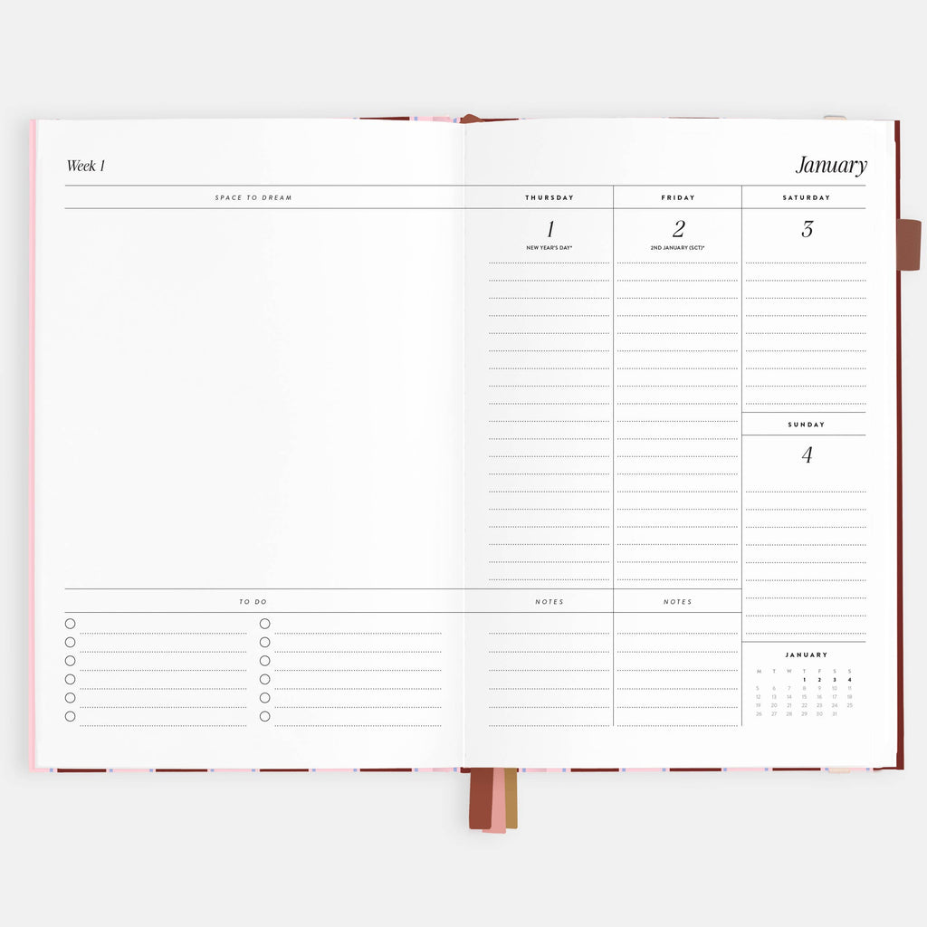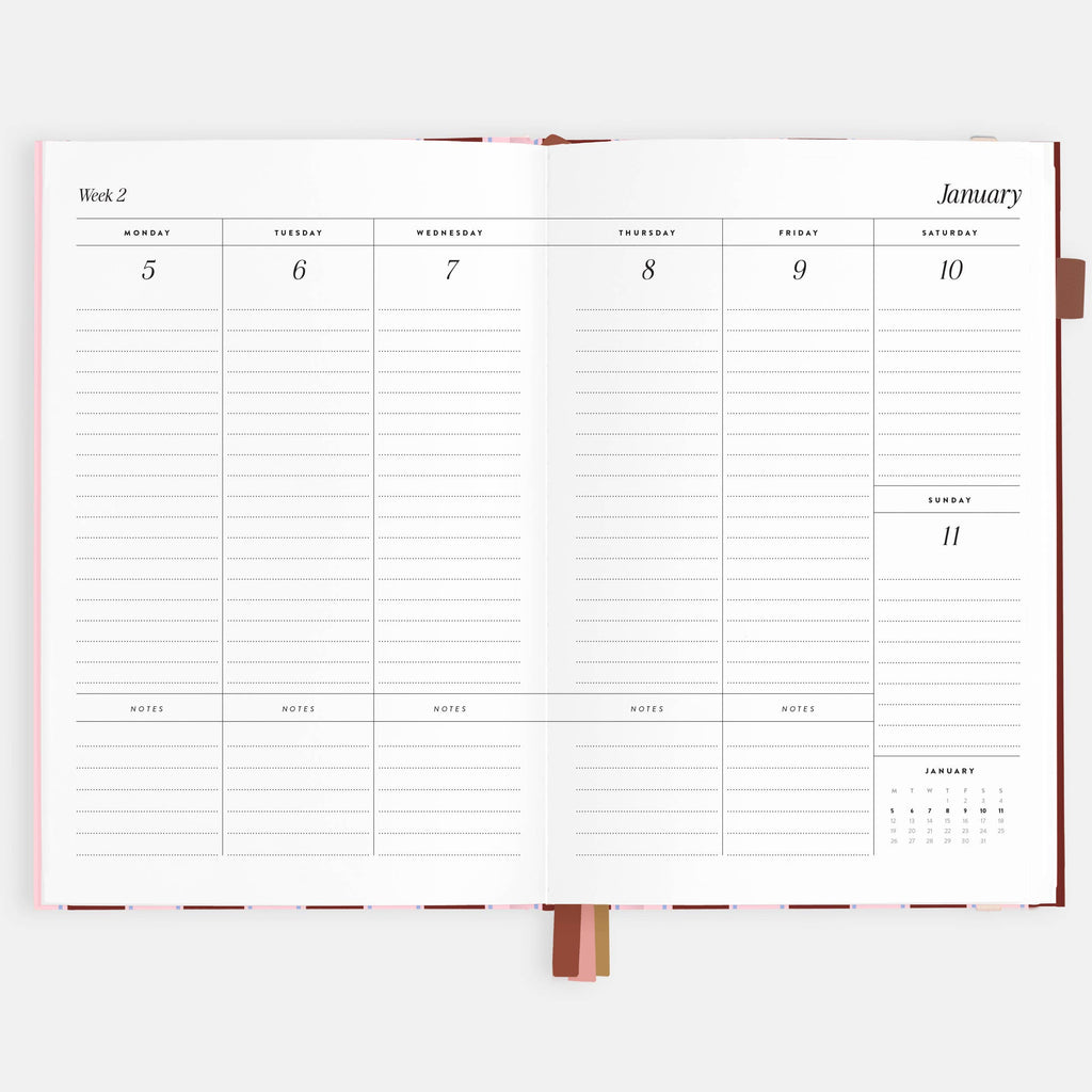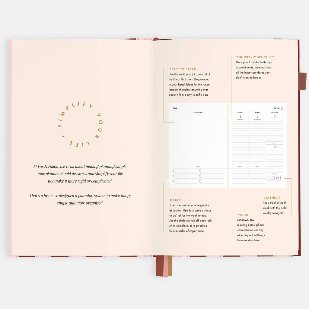 Our best-selling A5 planners are back with a brand new vertical layout and a new planning system designed to simplify your life. At Fox & Fallow we're all about making planning simple. Your planner should de-stress and simplify your life, not make it more rigid or complicated. That's why we've designed a planning system split into two halves - for your left and right brain. Featuring a vertical weekly layout, lay-flat binding, elastic closure and pen loop, document pocket at the back, three ribbons, gold foil edges, added blank pages. One week per spead and monthly spreads at the beginning of each section. Premium 120gsm paper. 208 pages.