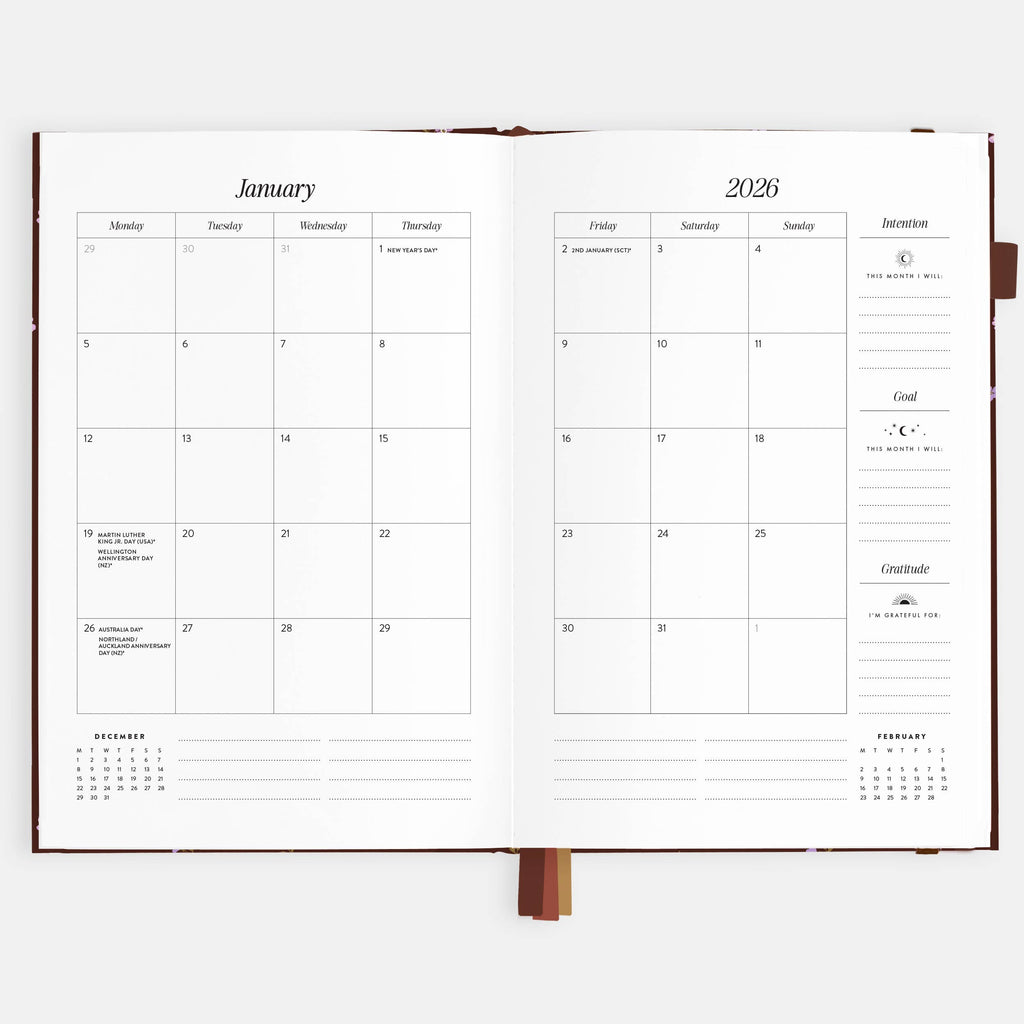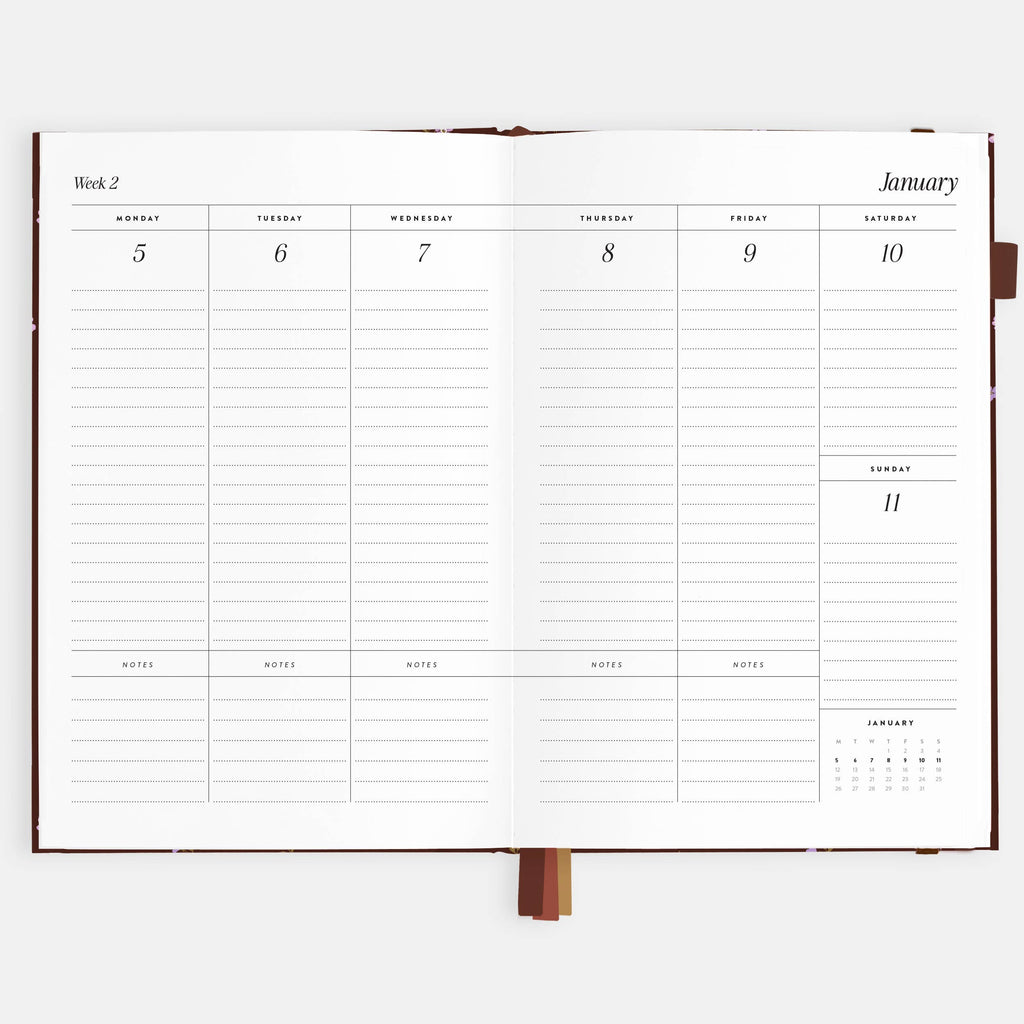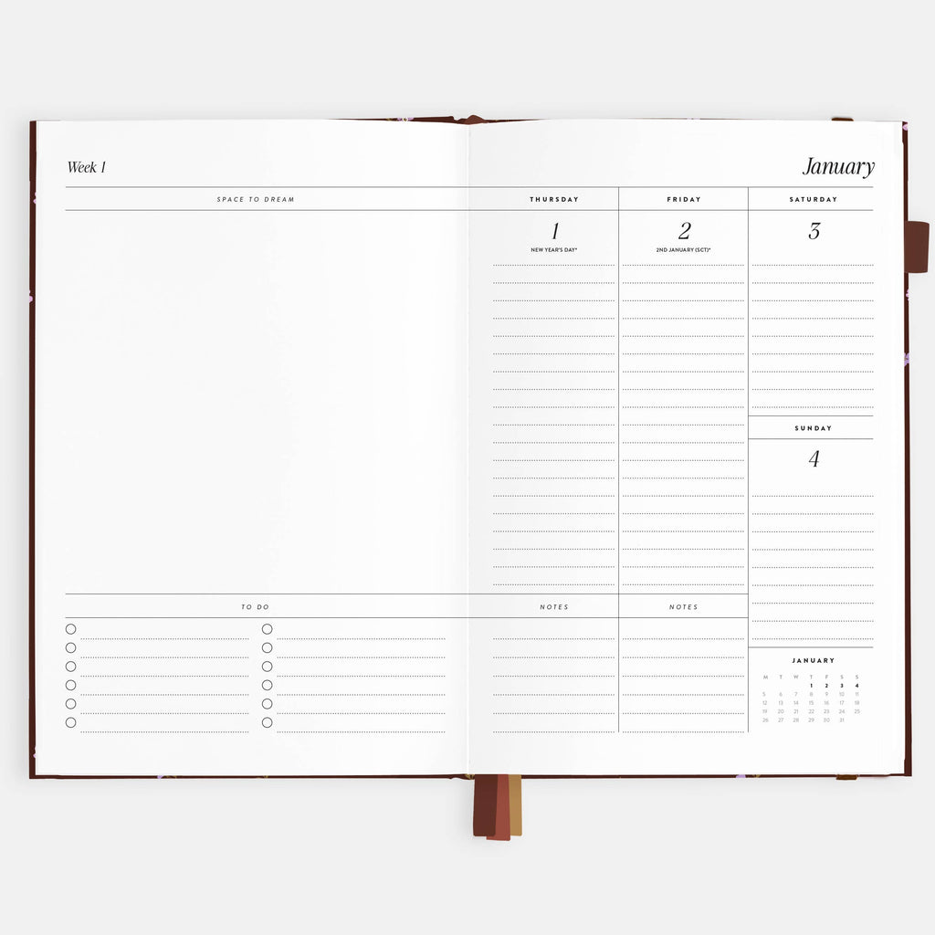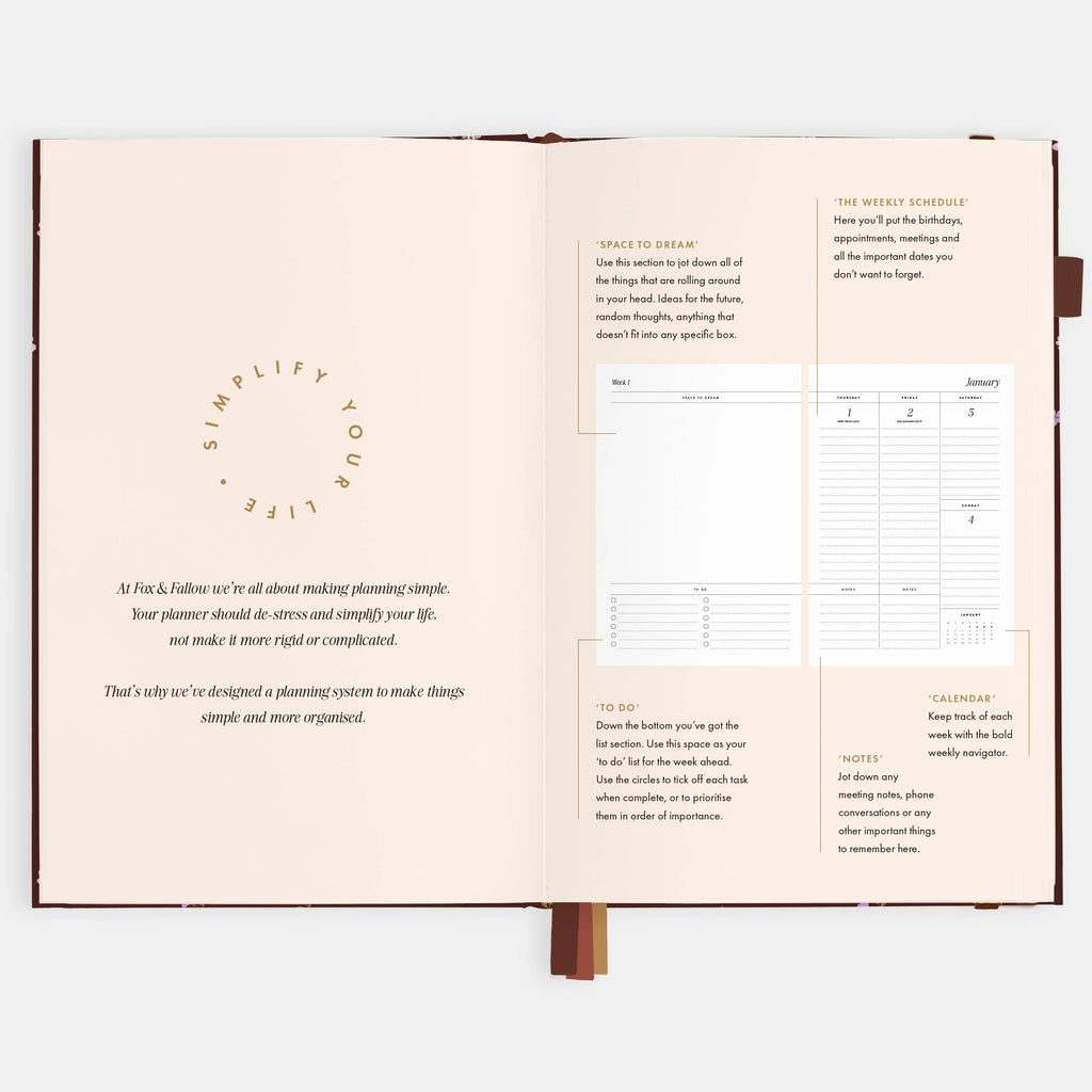 Our best-selling A5 planners are back with a brand new vertical layout and a new planning system designed to simplify your life. At Fox & Fallow we're all about making planning simple. Your planner should de-stress and simplify your life, not make it more rigid or complicated. That's why we've designed a planning system split into two halves - for your left and right brain. Featuring a vertical weekly layout, lay-flat binding, elastic closure and pen loop, document pocket at the back, three ribbons, gold foil edges, added blank pages. One week per spead and monthly spreads at the beginning of each section. Premium 120gsm paper. 208 pages.