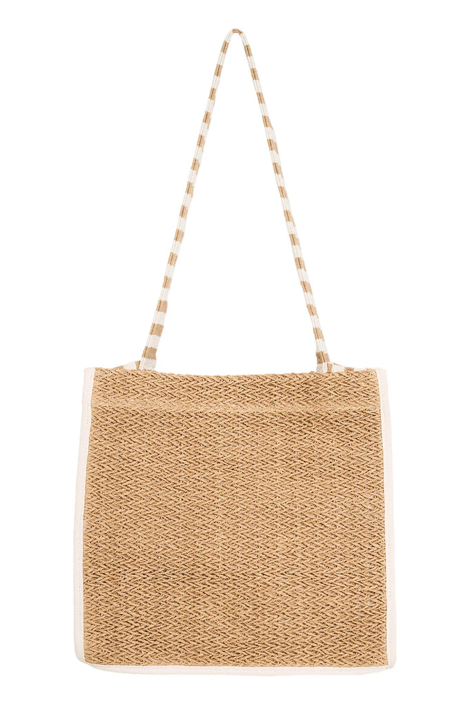 A deep, durable shopper bag with a single striped shoulder strap. Featuring mixed panelling of natural woven straw and modern striped cotton. Designed with a secure internal zip pocket and a spacious shape to carry everything you need - an elevated everyday essential.