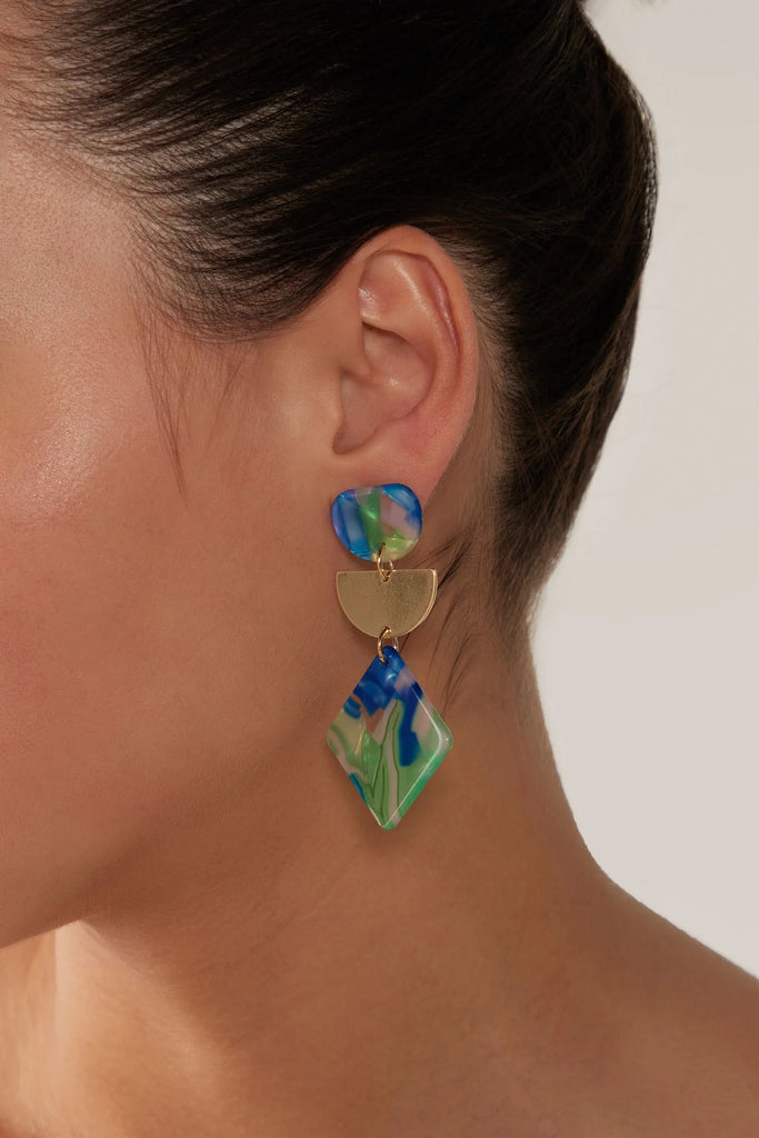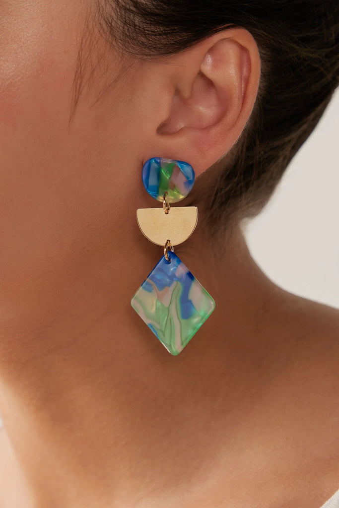 Featuring acrylic and metal forms for a unique layered look, these drop earrings add a soft colourful accent to your accessories collection.