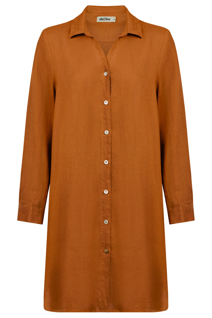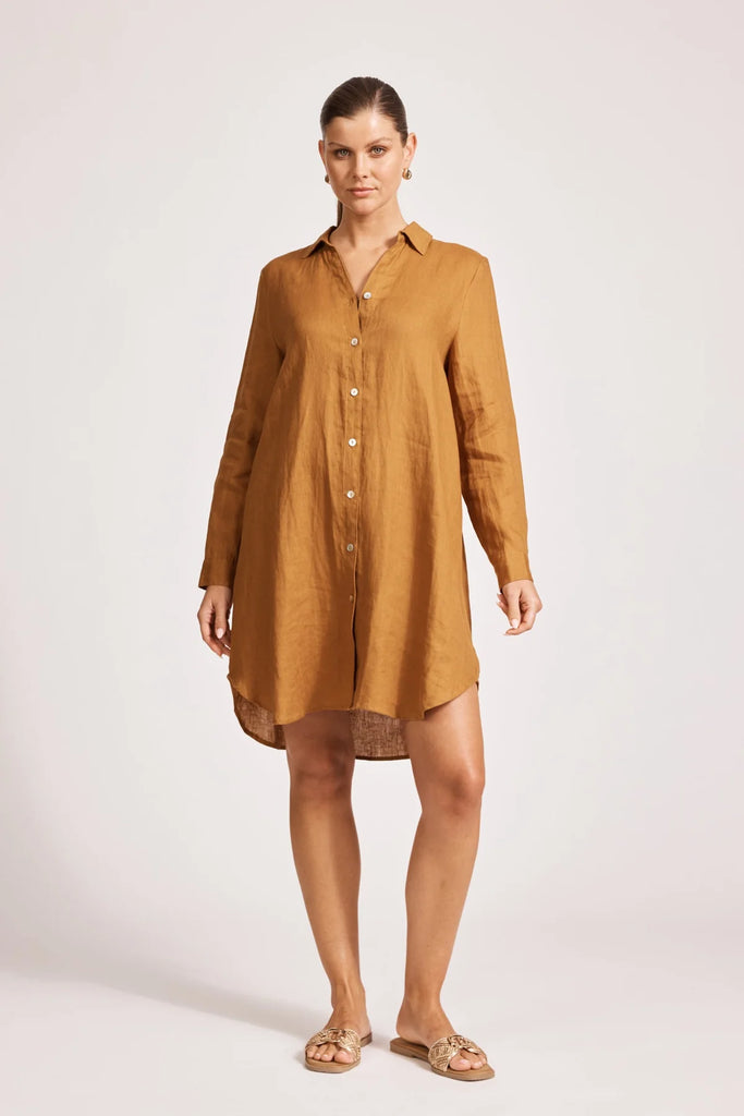 A relaxed staple shirt dress, perfect for warm weather holidays. Crafted from 100% Linen for breathable ease. Features a classic collar, shell button-through front, long sleeves, curved hemline, and functional pockets.