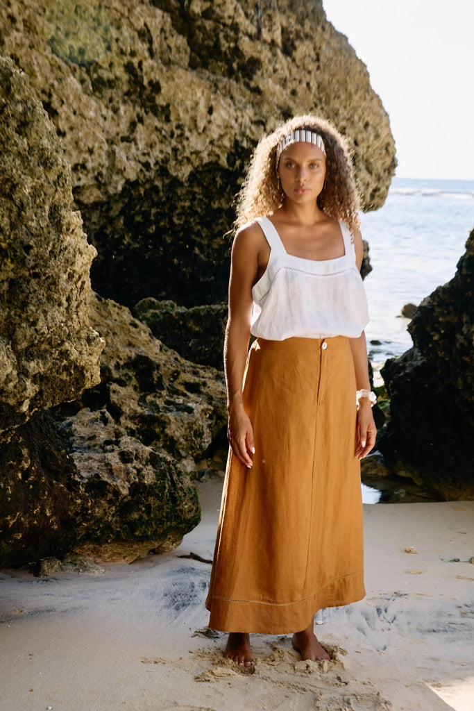 A timeless warm-weather essential. Crafted from 100% linen for breathable comfort. Features a square neckline, wide shoulder straps, and ladder lace trim detail. Designed in a structured, slightly cropped silhouette.