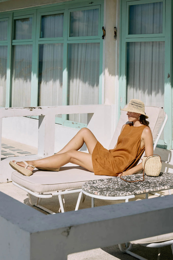 A relaxed linen dress designed for warm weather ease. Crafted from 100% linen with a soft A-line silhouette. Features exposed shoulders, side pockets, contrast topstitching on the front panel, button closure at the back neck, and wide cuffed hem.