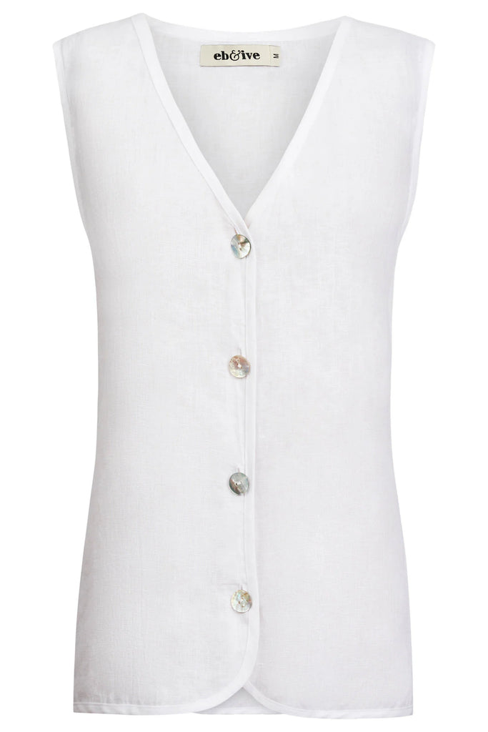 A relaxed essential with tailored flair. Crafted from 100% linen for breathable style. Features front button closures, curved hemline, and a D-ring puller at the back for a custom flattering fit at the waist.